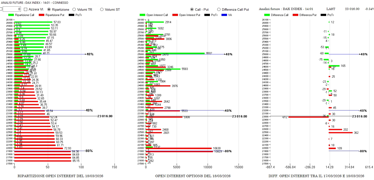Anche qua i prezzi si trovano centratissimi  su Va+0 e gli operatori continuano ad alleggerire contratti, sia sul lato put che sul lato call. Da segnalare solo un aumento in spread di call a 23000 e 26000.