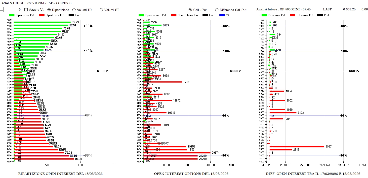Nonostante il forte ribasso gli operatori hanno riposizionato importanti quantità di put su strike Otm a partire da 6350 fino 5400. Call in lieve aumento a 6700 e 7000. Prezzi comunque bilanciatissimi a ridosso del proprio fair value.
