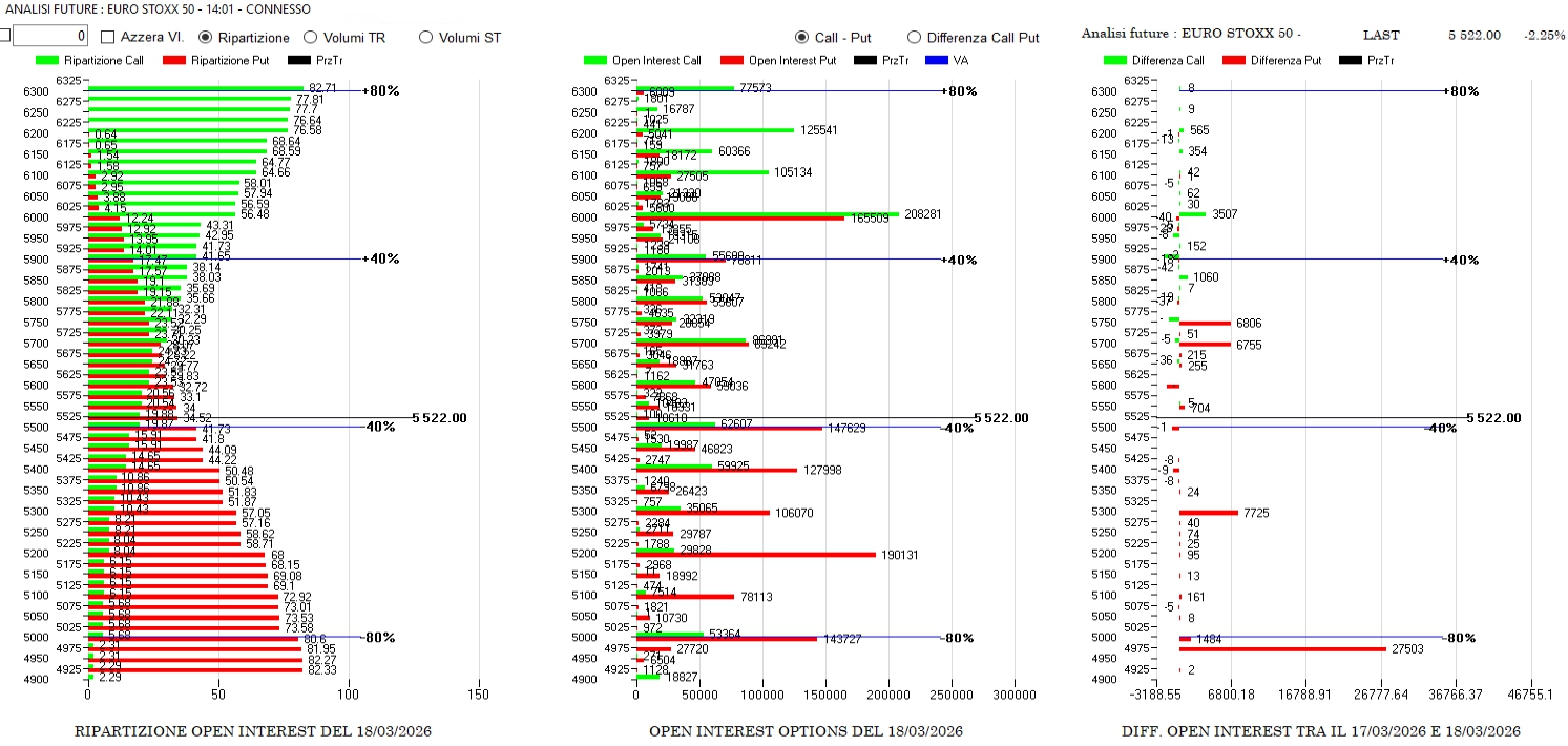 Prezzi a ridosso di Va-40 ed aperture in spread di put Itm a 5750 e 5700 e di contratti Otm a 5300 e 5000. Figura che assomiglia tantissimo ad un ratio spread coperto dal un long spread e che prezza calo delle quotazioni o lateralità ma senza particolari picchi di volatilità