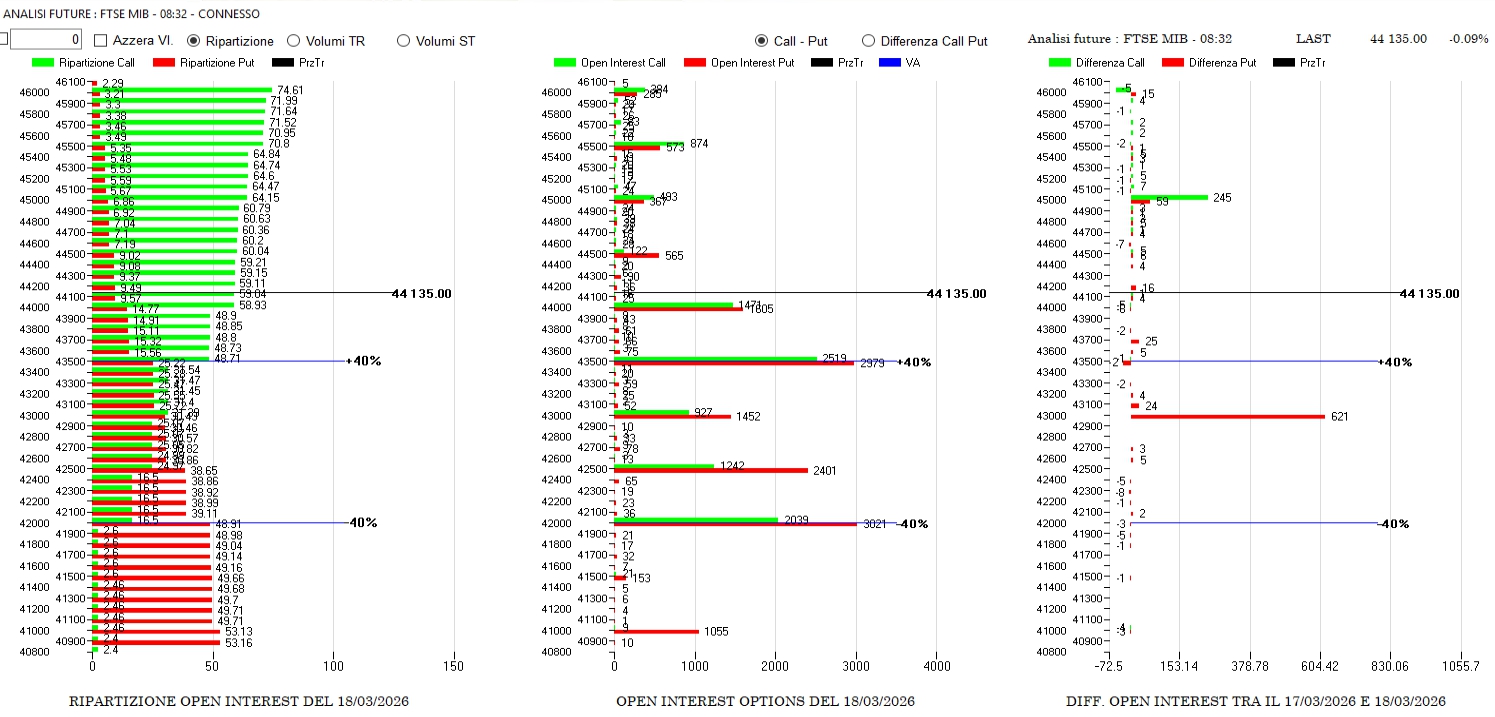 Prezzo ancora sopra Va+40 e operatori che riposizionano contratti put a strike 43000 e call a 45000.