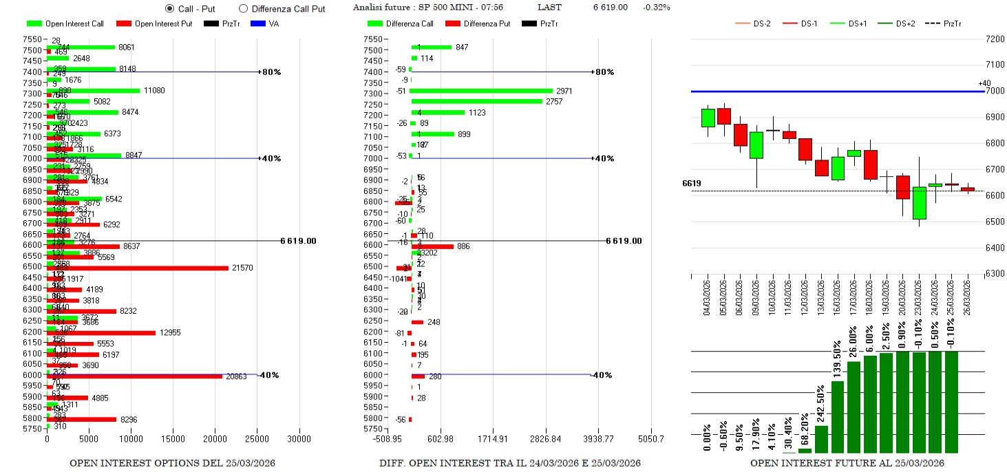 Mercato sempre centrato nella propria area di Fair Value e operatori che mantengono alta la componente future. Sul lato opzioni si registrano notevoli ingressi di call Otm da strike 7100 a strike 7300 e sul lato put piccoli alleggerimenti e un solo nuovo ingresso in area 6600.