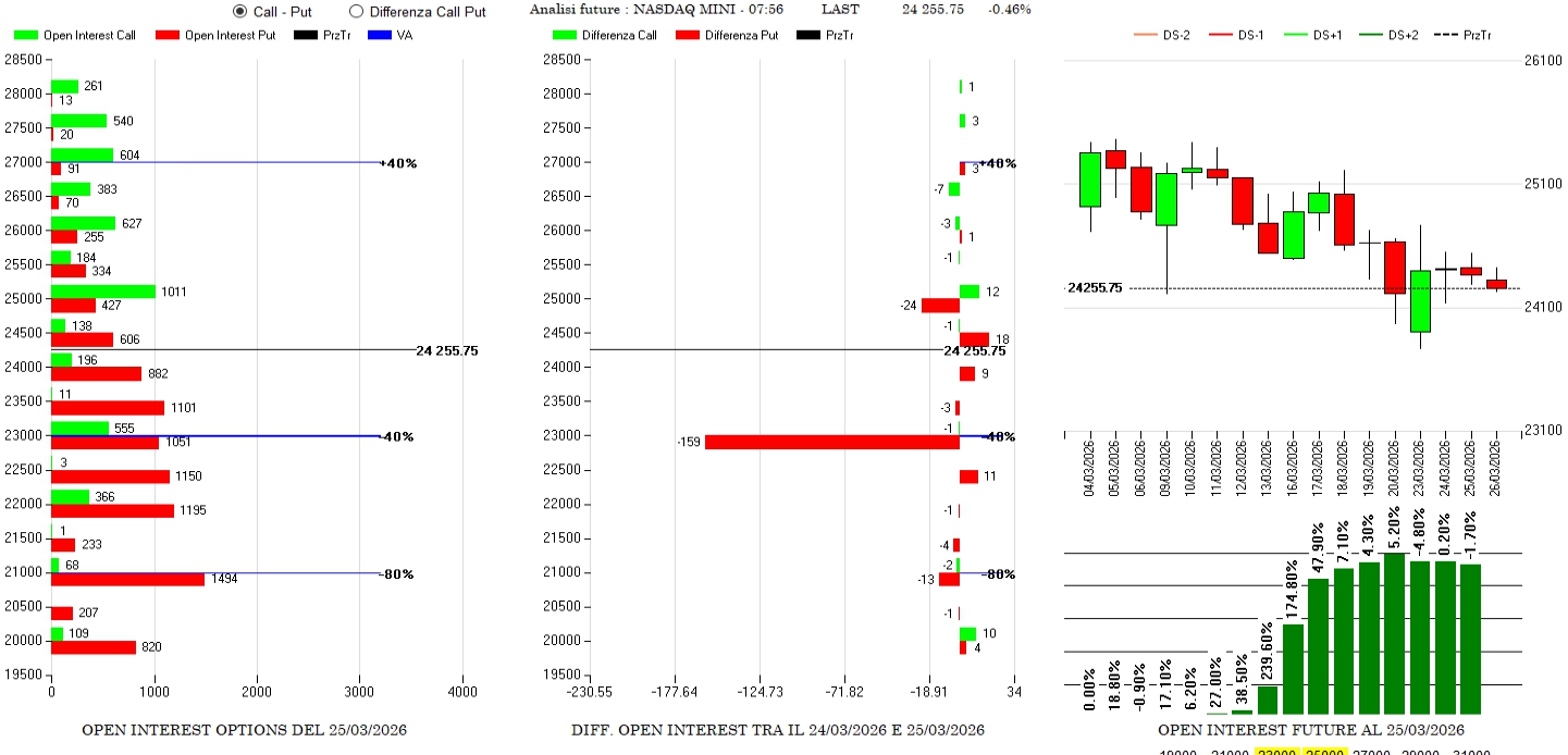 Sul Nasdaq, al contrario, si assiste ad un forte alleggerimento della pressione della componente future e a chiusure importanti sul lato put a strike 23000.
