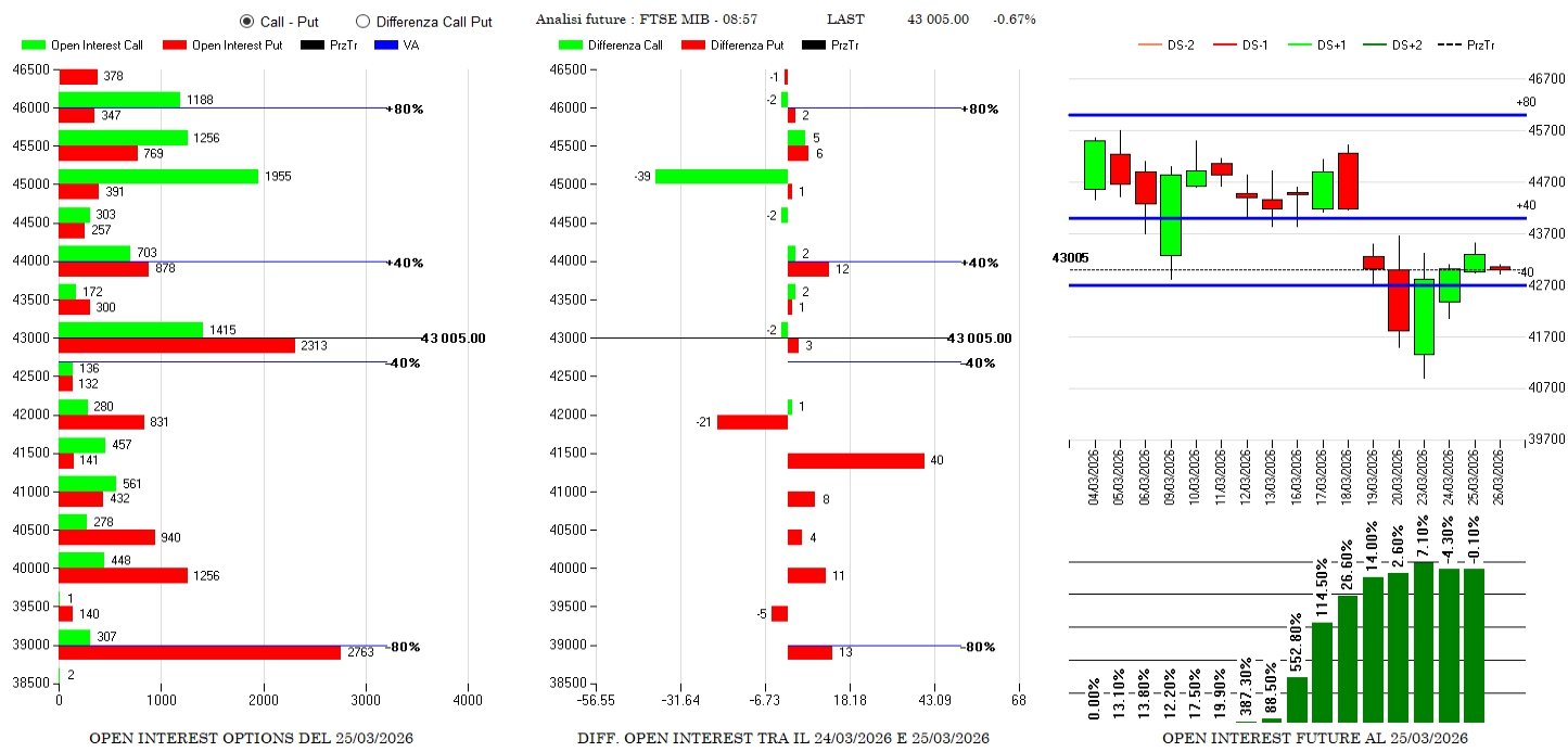 Anche sul nostrano i prezzi sono rientrati all’interno della propria area di indifferenza e gli operatori hanno aggiustato le posizioni riposizionando put a 41500 e togliendo call a 45000.