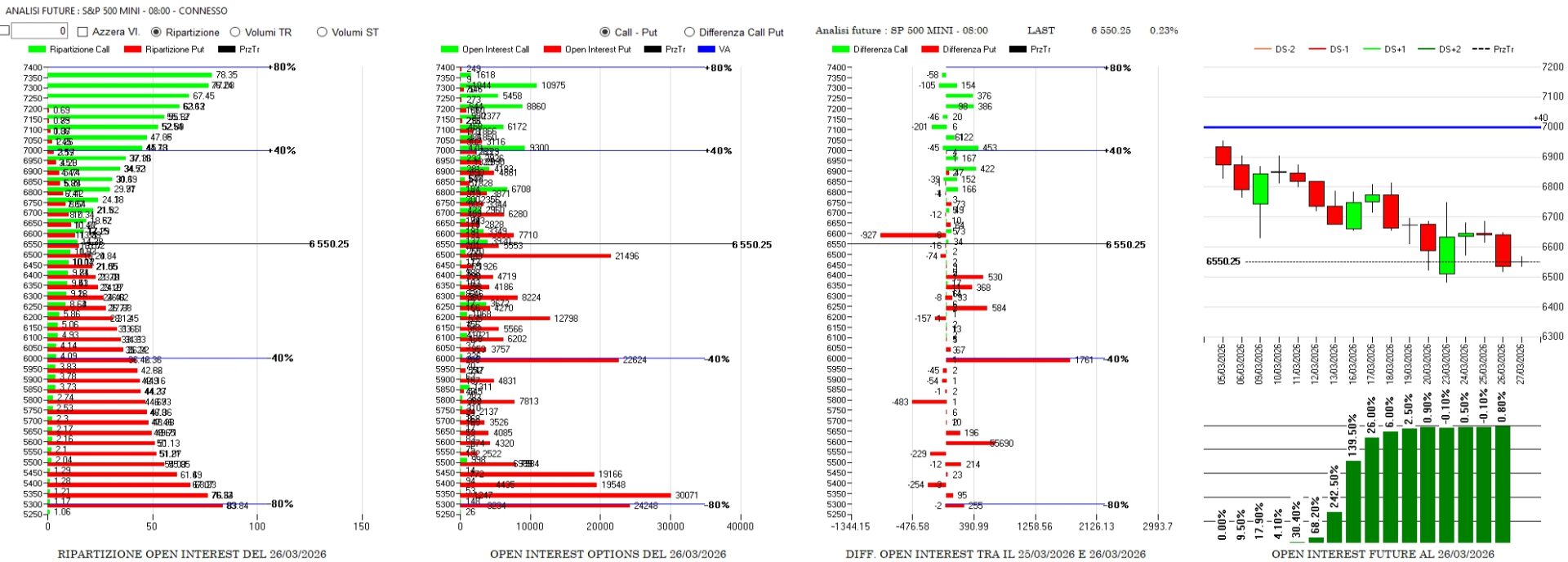 Mercato ancora bilanciatissimo con prezzi esattamente nel cuore del fair value e operatori che riposizionano rischio effettuando rollover esterni di put, con chiusure a strike 6600 e nuove aperture a 6400 e soprattutto a 6000, mentre sul lato call si assiste solo a nuovi ingressi a partire da area 6900 fino a 7300. Componente future in lievissimo aumento con prezzi a contatto con il primo importante livello di gamma put.