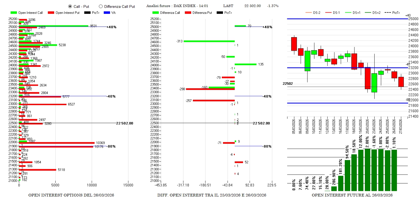 Mercato leggermente più sbilanciato e ancora più a contatto con livelli di gamma put che richiamano coperture e ordini condizionati. Da notare il forte aumento della componente future che sale del +4,70% sulla rottura dei livelli tecnici 23200/231000 a cui però non fa seguito un adeguato supporto di call che, al contrario, sono state alleggerite a strike 26000. Di contro si assiste ad un rollover esterno di put con chiusure a 23500 e nuove aperture a 23000 e 22500 e su strike Atm 24000 che, come su Sp, ricordano il profilo di rischio di un ratio spread che trae vantaggio da una diminuzione di volatilità e prezzi in tendenza lateral ribassista.