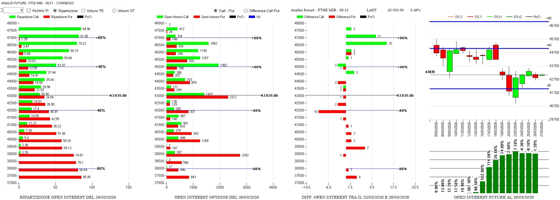 Piccole chiusure di put a strike 42000 e riposizionamenti di call a 4700 e 46500. Future in lieve calo con prezzi centrati sulla ripartizione e nel punto di attrazione dominato da importanti quantità di put e call a strike 43000