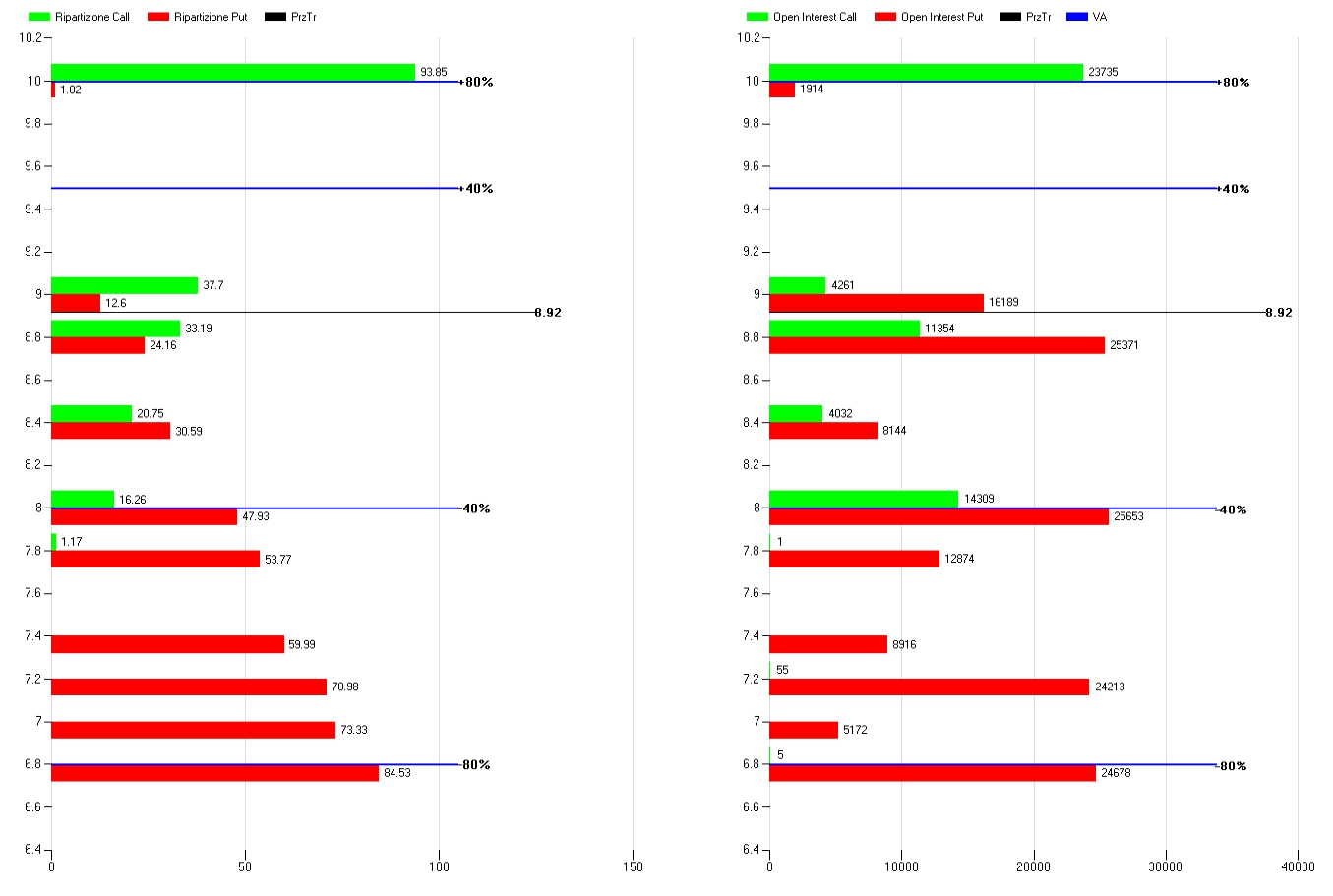 Il grafico dei Totali Open Interest conferma che gli operatori hanno piazzato numerose Put nette tra 7,8 e 6,8 e hanno dovuto ricoprire con costruzioni sintetiche le aree tra 9 e 8.