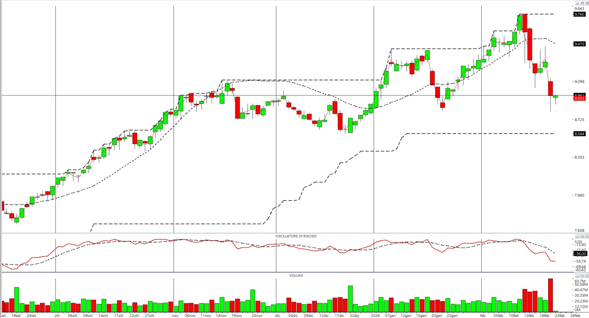 Attualmente il titolo quota ora a 8,90 euro dopo un calo da 9,29, causato dal decreto energia che ha generato sell-off settoriale (da 9,18 euro il 17/02 a 8,80 previsto 19/02).