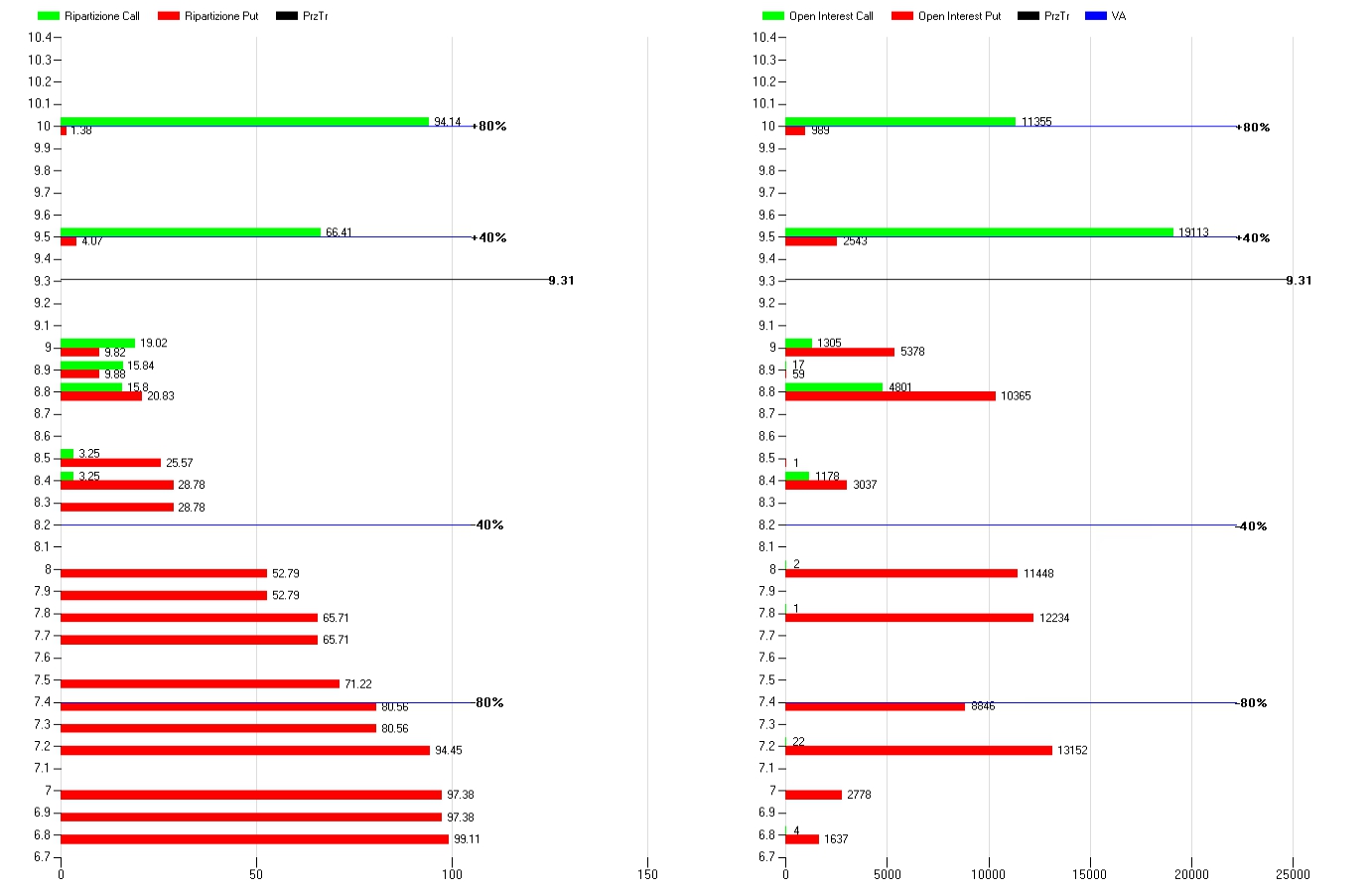 A destra il grafico della ripartizione e a sinistra il grafico dei totali di call e put per strike.