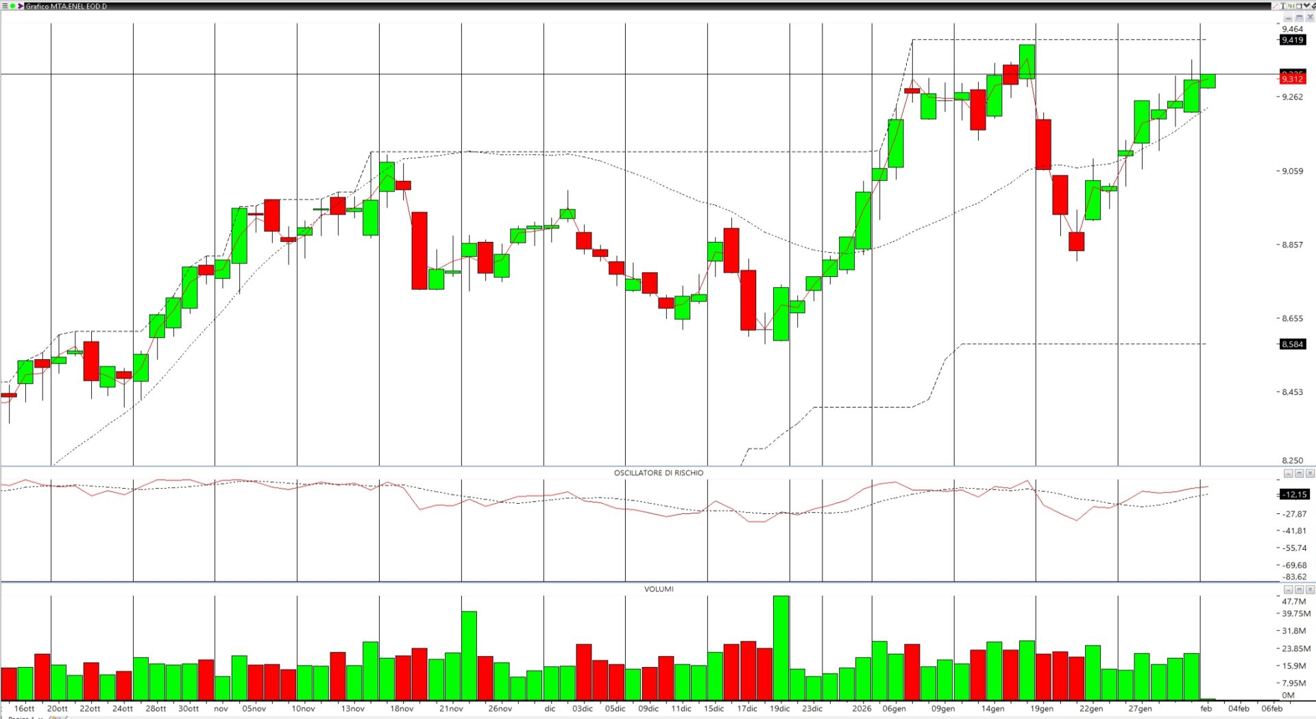 Al momento il range si trova tra 8,584 e 9,419. I primi supporti sono in area 9,100 e la resistenza è rappresentata esclusivamente dall’area di massimi. La regressione lineare e’ comunque sotto al prezzo e in pendenza positiva e anche l’oscillatore di rischio ci mostra forza e lieve momentum rialzista.