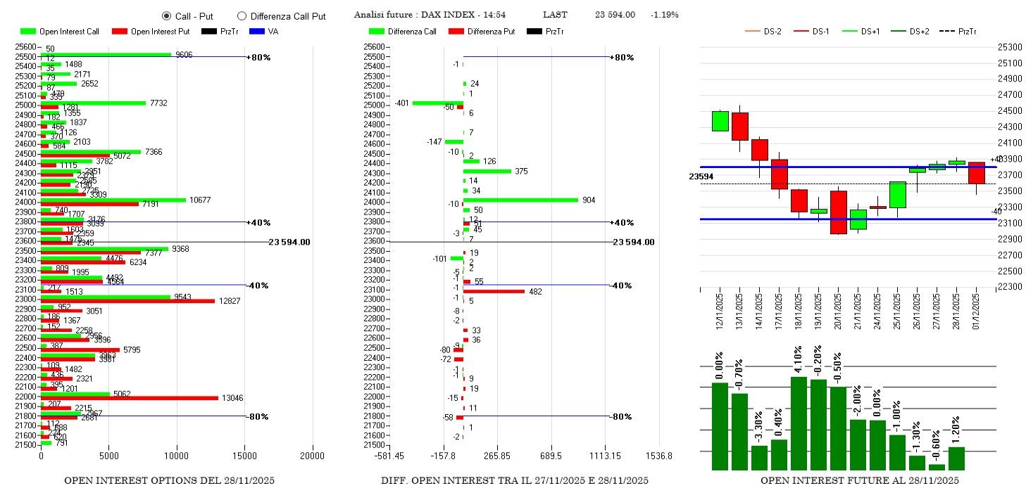 Su Va+40 si assiste ad un lieve aumento di future e ad un riposizionamento di put a 25000 e di call a 25500.