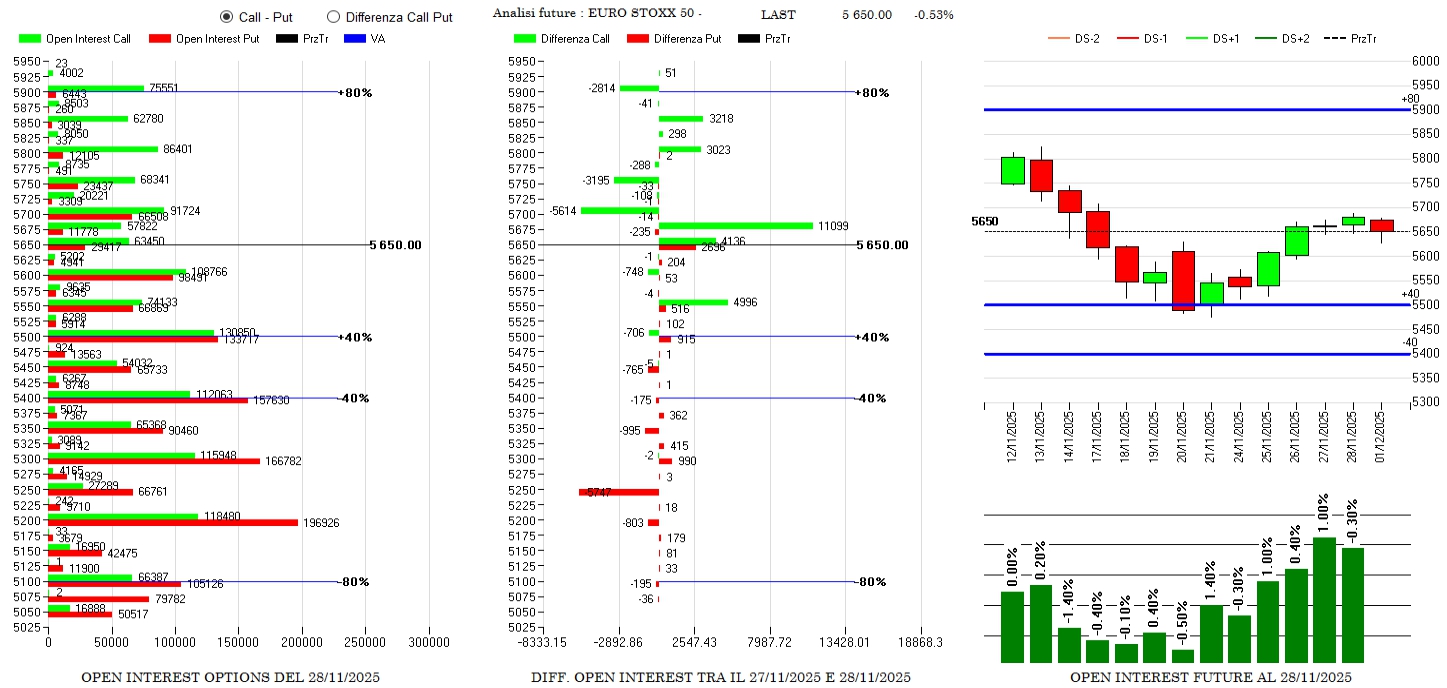 Prezzi sempre ben sopra Va+40 e future che mollano pochissimo nonostante giornate in range stretti. Call in aumento a 5675 e in chiusura tra 5700 e 5750 e put in chiusura. Da segnalare sempre l’ingresso costante di call Itm a supporto del trend e in funzione di ricopertura a strike 5550.
