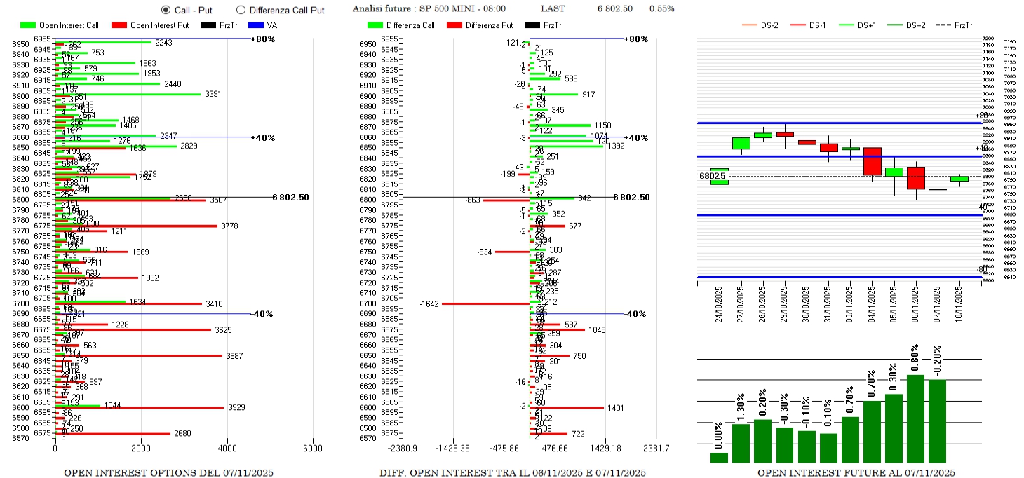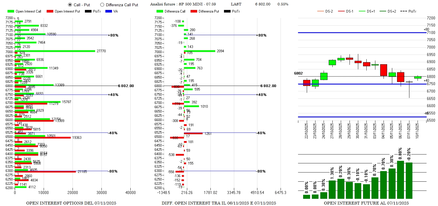 Forti flussi in uscita sul lato put con alleggerimenti a 6800, 6750 e 6700. Riposizionamenti di call tra 6850 e 6900. Future in lieve calo.