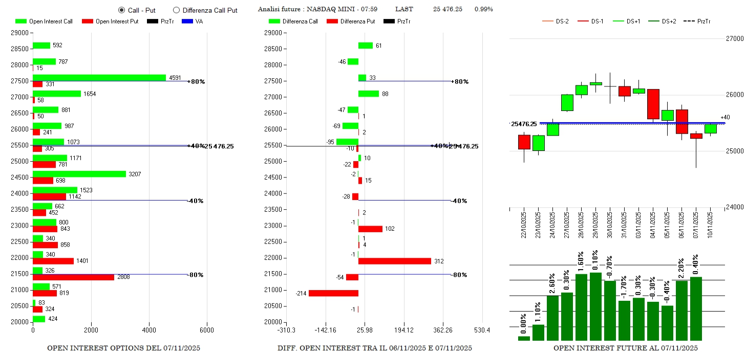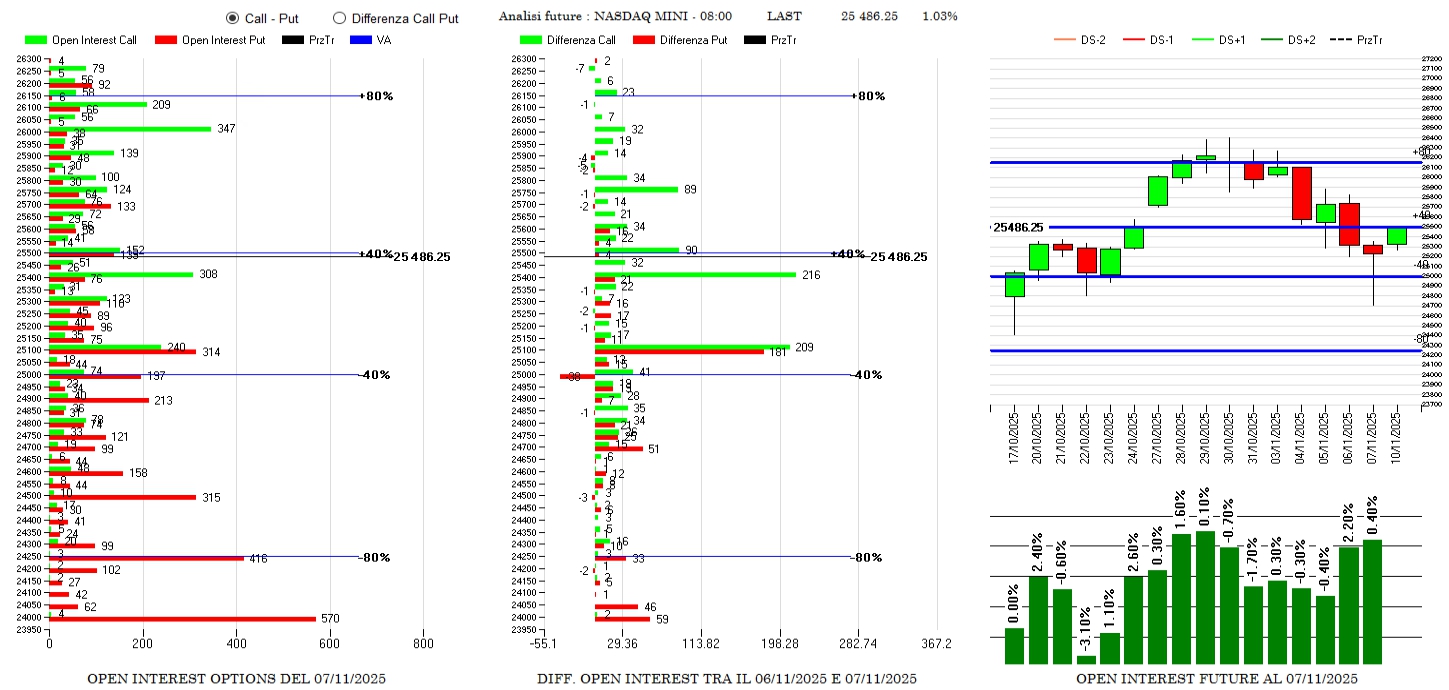 Forti ingressi di call tra 25750 e 25400. Ricoperture sintetiche a strike 25100 e poco lavoro sul lato put. Future sempre in pressione con prezzi a ridosso di Va+40.