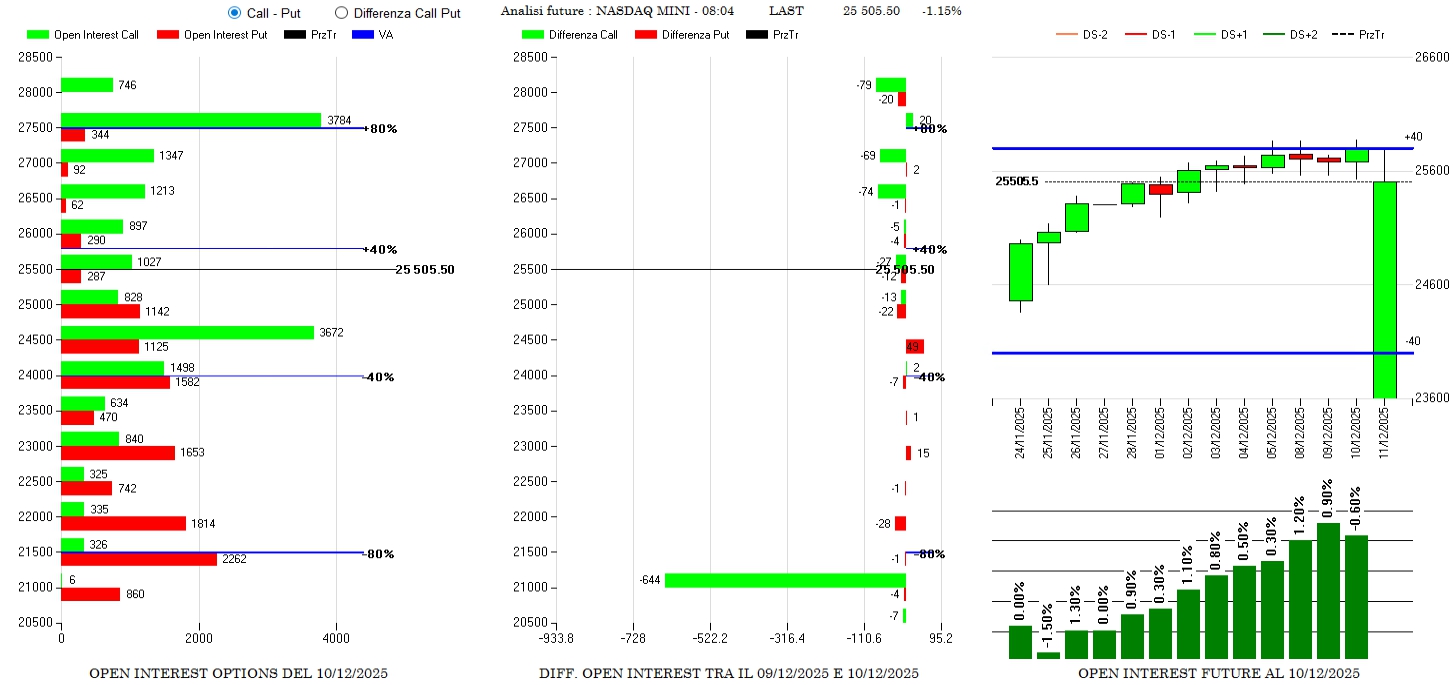 Continuano gli alleggerimenti e i rollover esterni di call con chiusure a 24400 e nuove aperture a 24500 e 25000. Anche sul lato put piccole chiusure in area 23600 e aperture a 23500 e 22500