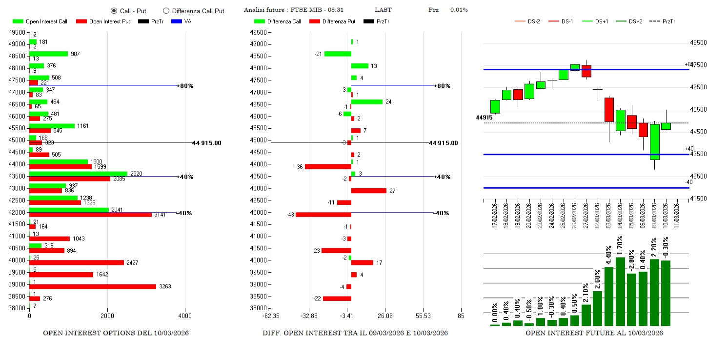 Rollover esterno di put con chiusure a 44000 e 42000 e nuove aperture a 43000 e 40000. Sul lato call piccoli ingressi a 46500 e 48000 e future stabili e sempre in pressione