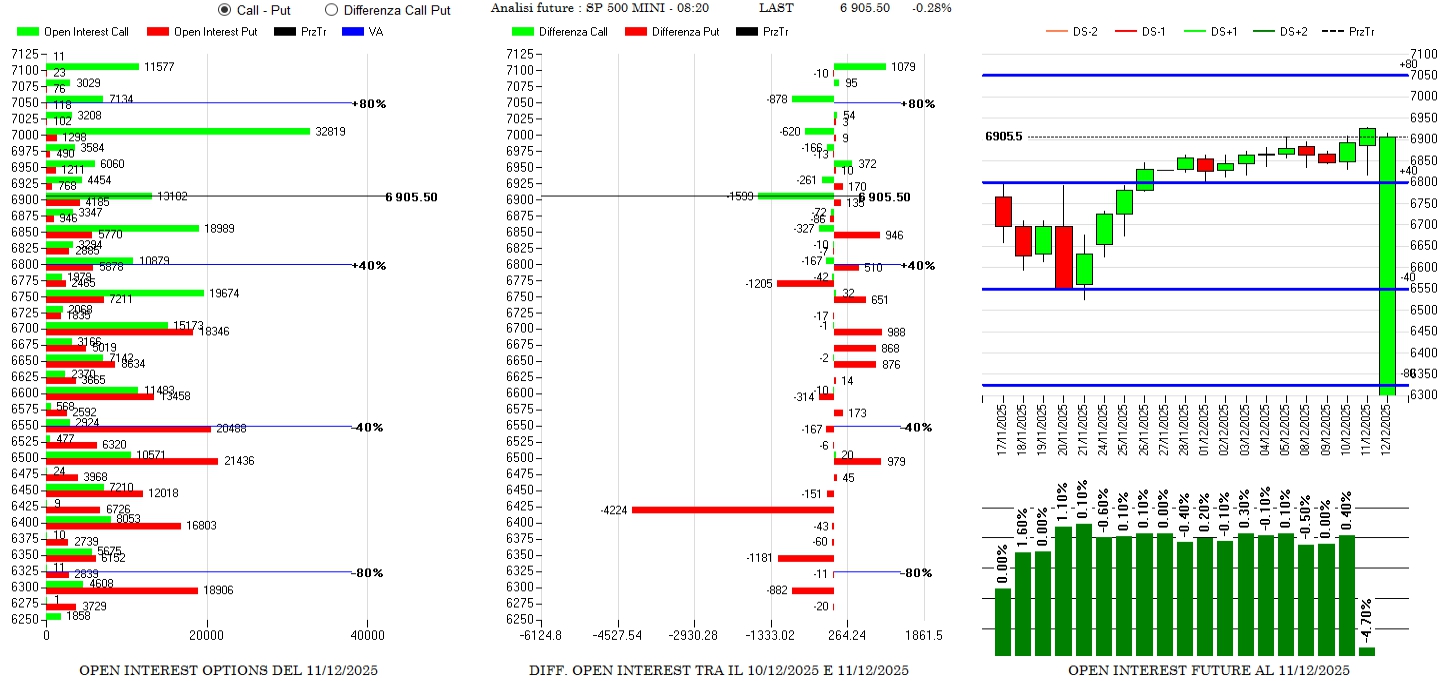 Forti chiusure di future per l’effetto rollover e riposizionamenti di put tra 6850 e 6500 e chiusure di call da 6900 a 7050 e nuovi contratti posizionati ben sopra Va+80.