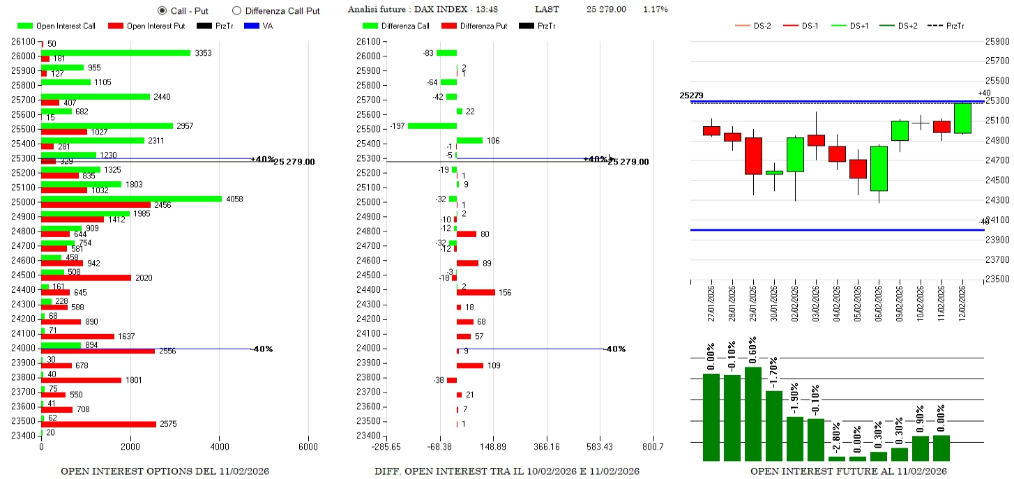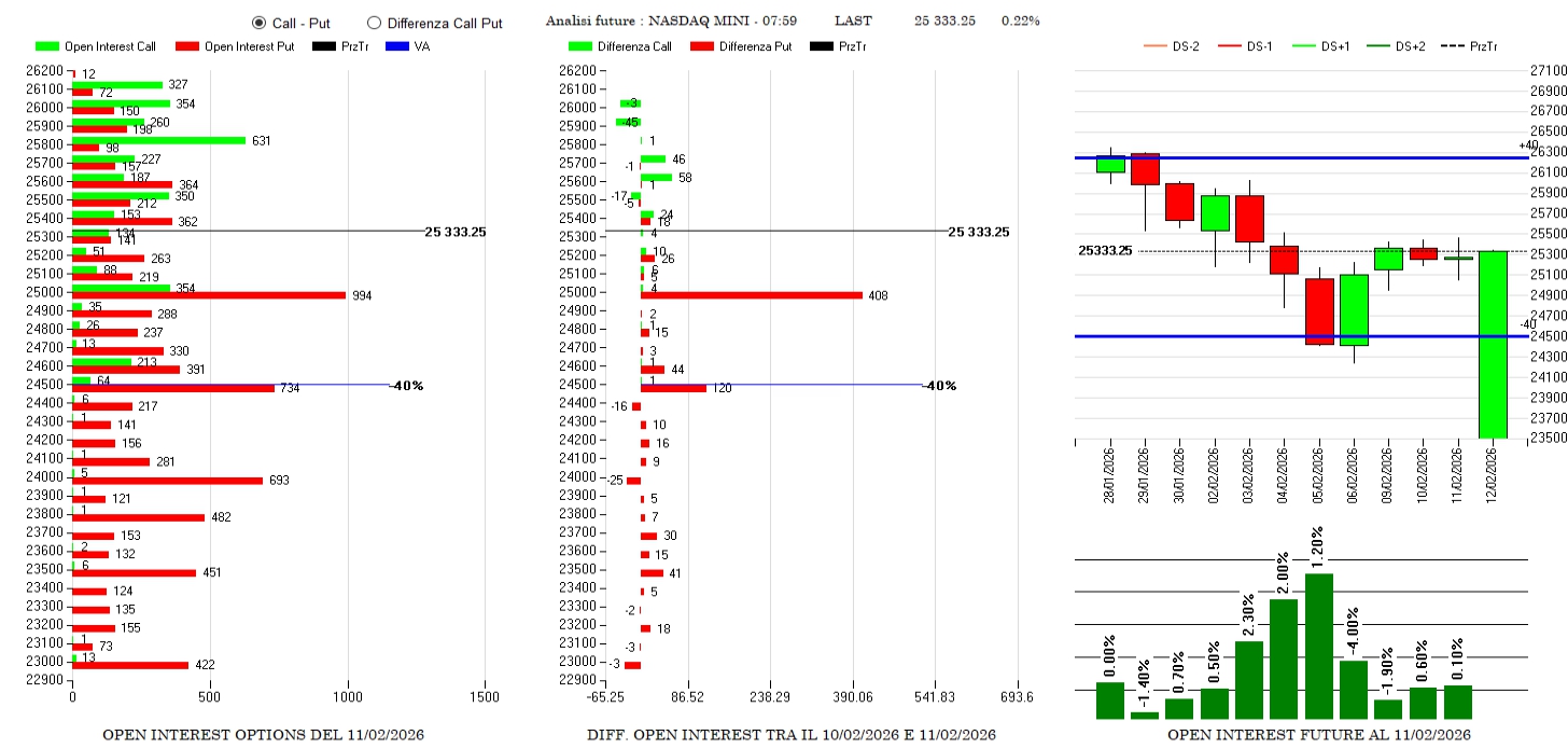 Anche qua a farla da padrone sono le put che vedono discreti aumenti di contratti a strike 25000 e 24500. Piccoli scambi ingressi di call solo sopra 25600 e future poco scambiati e ai minimi termini.