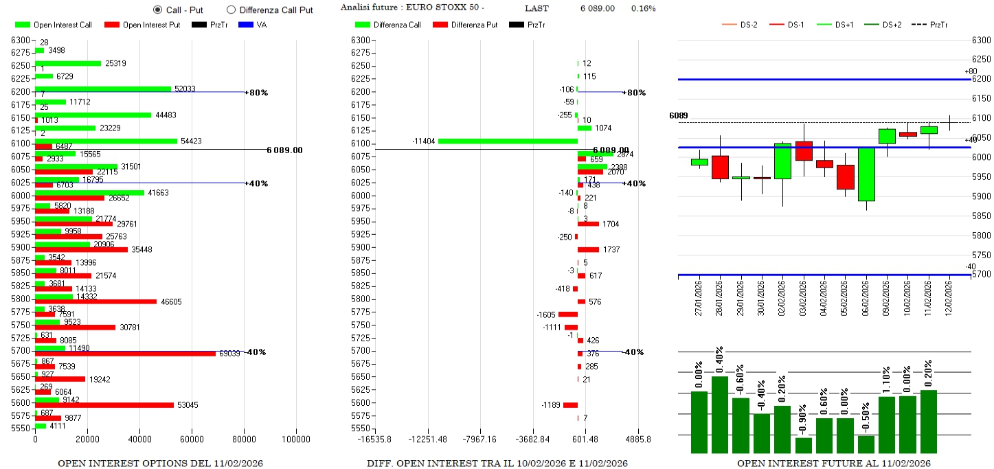 Ancora forti chiusure e alleggerimenti di call a strike 6100, tante ricoperture sintetiche a 6075 e 6050 e put in aumento sotto al prezzo con future sempre in pressione