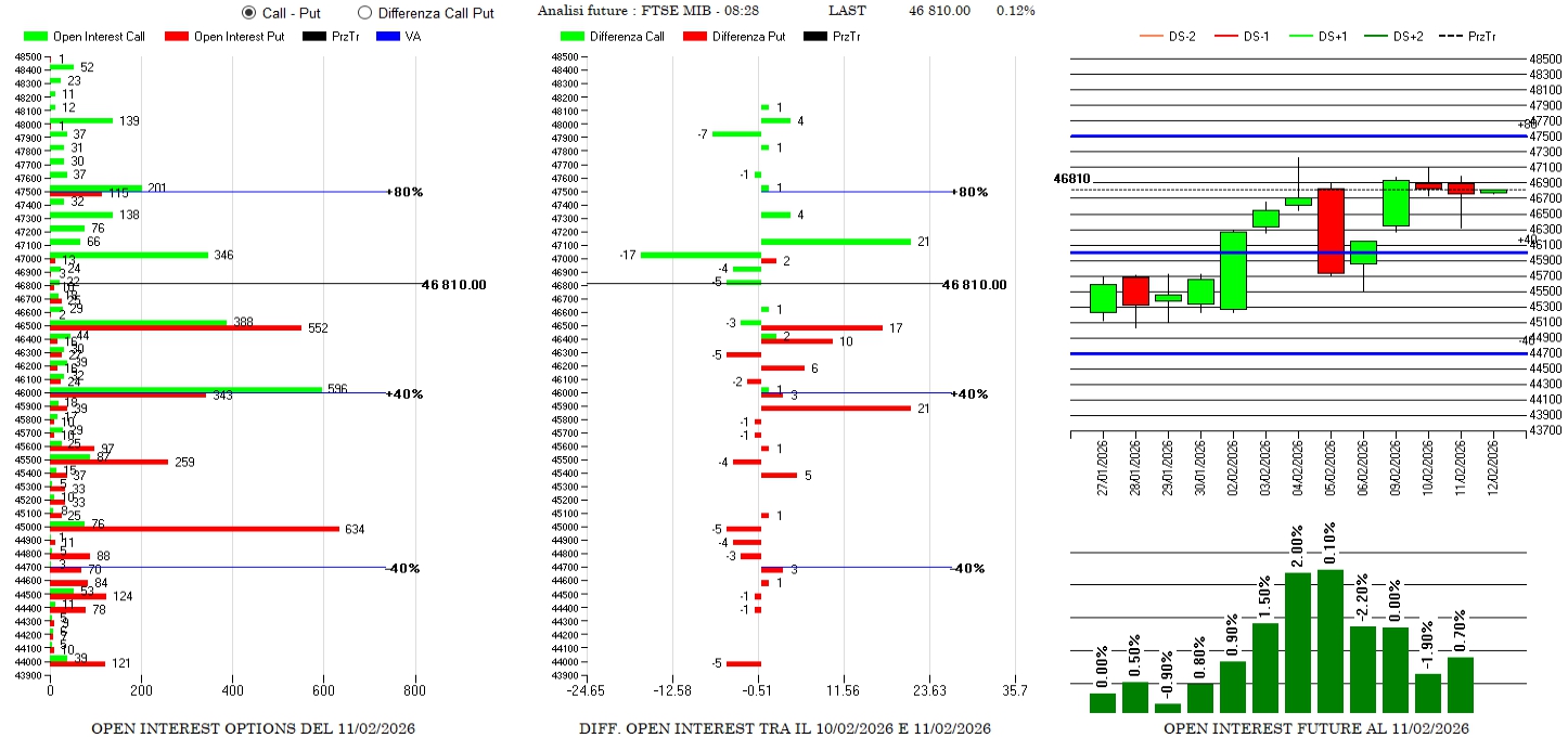 Piccoli riposizionamenti di put a conferma dei supporti e rollover esterni di put da strike 47000 a strike 47100. Future in lieve aumento ma non in fase.