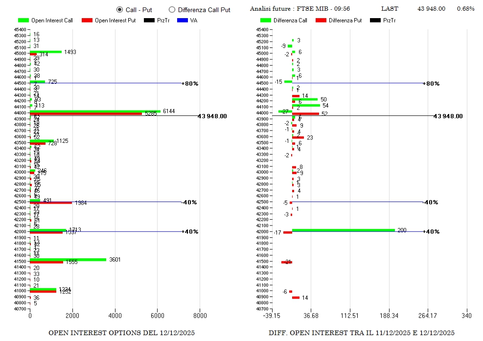 Sembra esserci ancora forza sul Fib confermata dal numeroso ingresso di call Itm a strike 42000 che hanno scopo di copertura essendo i prezzi quasi a ridosso di Va+80. Per il resto poche movimentazioni tra 44000 e 44200 con riposizionamenti di put e call.