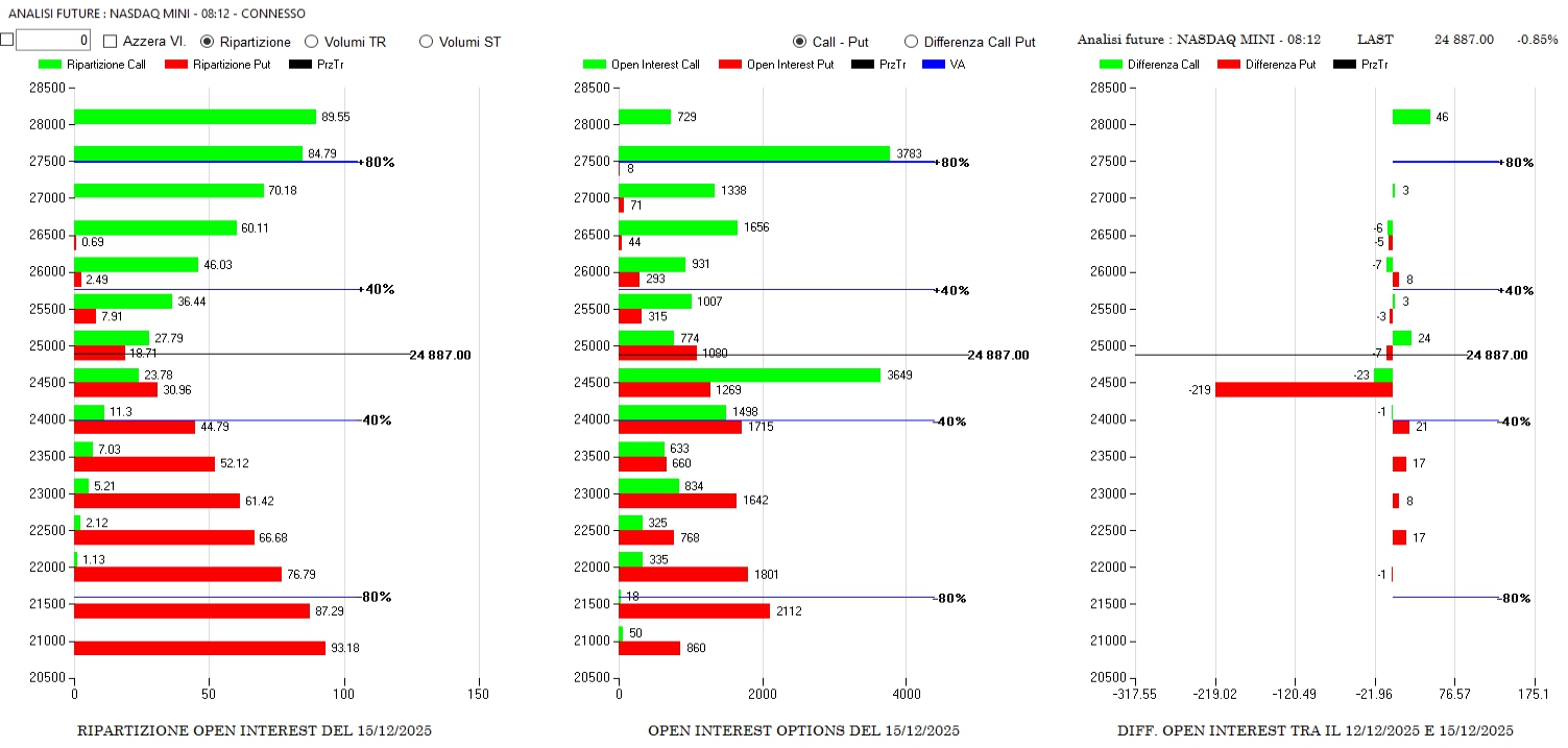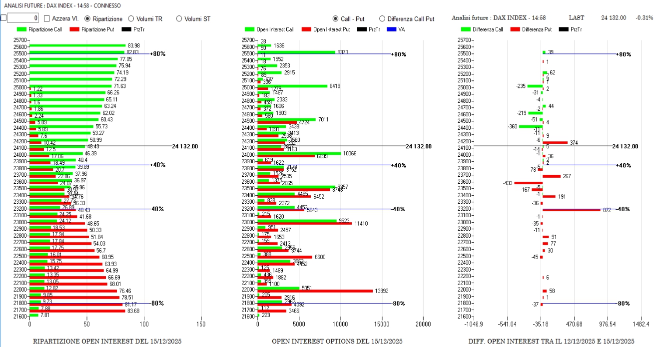 Prezzi centratissimi nel cuore della value area e operatori che chiudono in modo netto contratti put a strike 24500 e riposizionano piccole quantità di contratti, sia call che put, ai lati del prezzo.