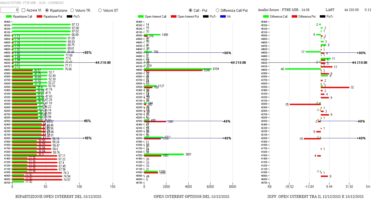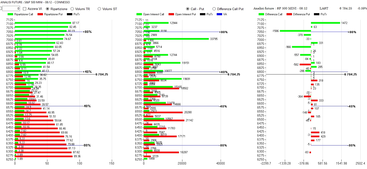 Forti alleggerimenti di call tra 6900 e 7050 e rollover esterni di put con chiusure a 6850 e riaperture a 6750 e 6600. Mercati che sembrano voler lasciare spazio di manovra ai prezzi con prezzi sempre a contatto con Va+40.