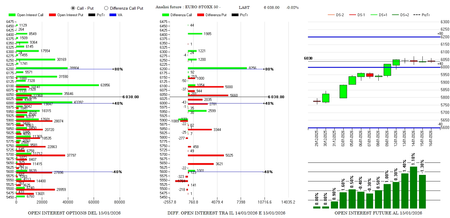Al contrario su Stoxx qualche operatore inizia a prendere profitto viste le chiusure pari a -1,3% dei future. Di contro, sul mercato delle opzioni si assiste a forti ingressi di put tra 5650 e 6100 e riposizionamenti di call Itm a 5950 e Otm a 6200. Prezzi che comunque rimangono stabilmente in area di delta positività