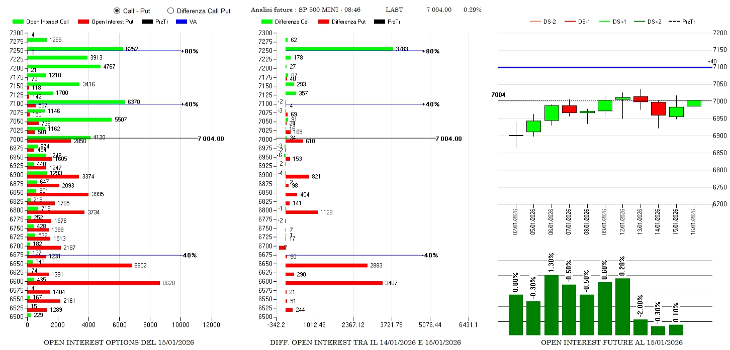 Riposizionamenti di contratti Otm con netti ingressi di call a strike 7250 e put a strike 6650 e 6600. Da segnalare i contratti put a 7000 e il basso uso della componente future visto che i prezzi si trovano ben centrati in una area di neutralità al gamma