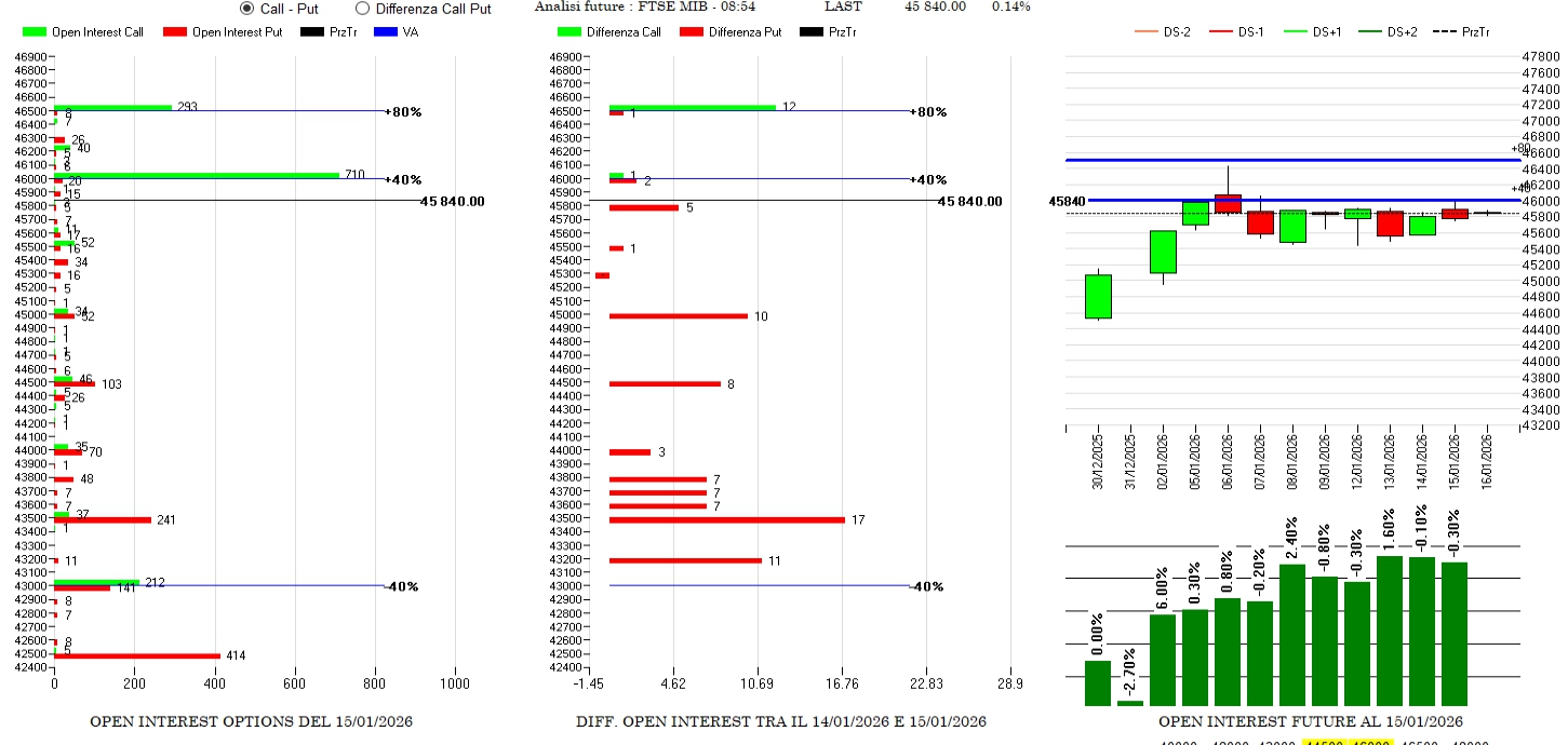 Su gennaio i prezzi, come abbiamo visto, sono arrivati con forza e persistenza su Va+80. Su febbraio gli operatori si sono ribilanciati spostando in alto il baricentro del fair value. Nella giornata di ieri pochi contratti a mercato con piccoli ingressi sparsi di put sotto al prezzo e un solo ingresso di call a strike 46500. Future sempre in pressione ma in lieve calo.