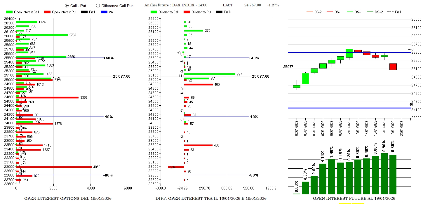 Nonostante la discesa ed il prezzo che si è riposizionato nel cuore della ripartizione, la componente future rimane comunque ancorata sui massimi di periodo e sul mercato delle opzioni si vedono riposizionamenti di call tra 25000 e 26100 e di call tra 24900 e 23500