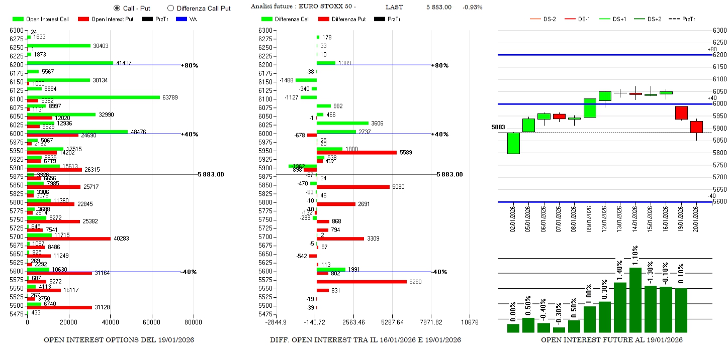 Anche Stoxx è rientrato dentro il cuore della ripartizione con un deciso calo della componente future e contemporaneamente a ingressi in rollover interno di call e riposizionamenti di put a 5850 fino a 5575. Ricoperture sintetiche a 5950