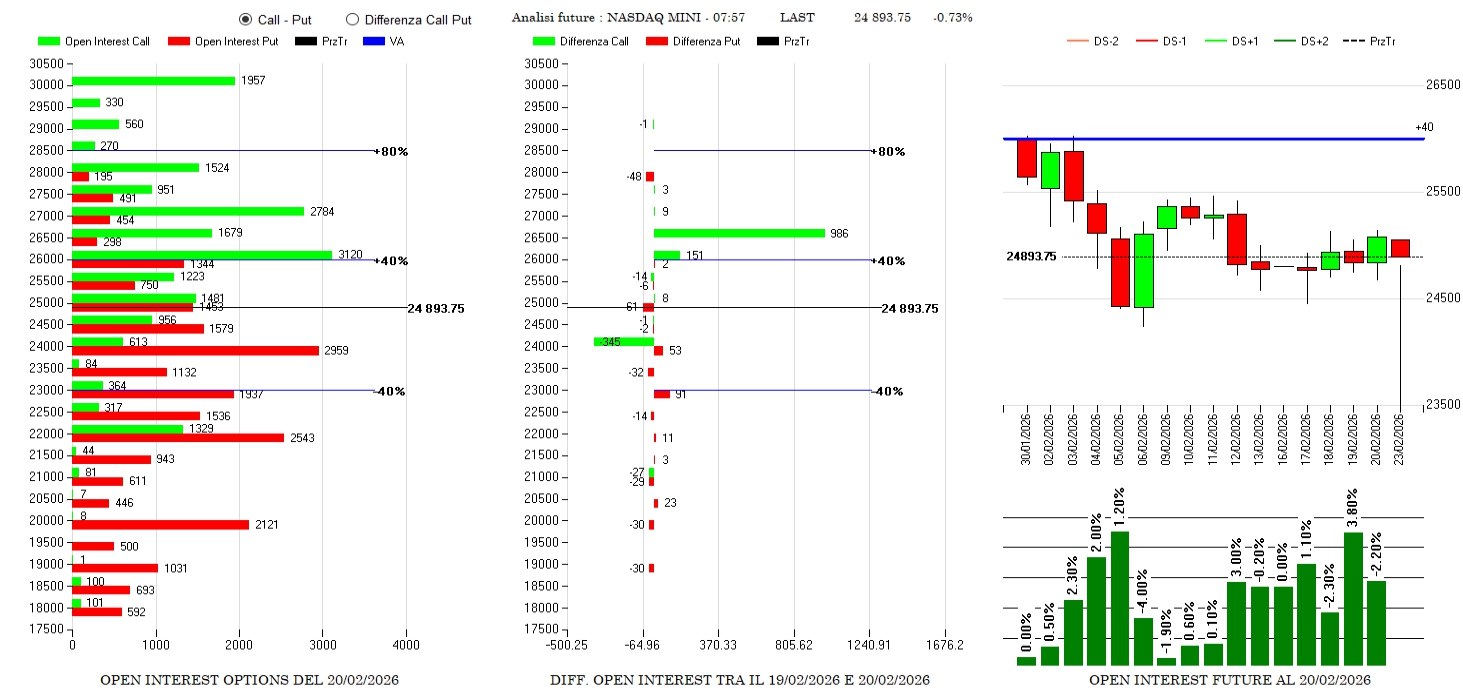 Alleggerimenti di call a 24000 e nuovi riposizionamenti in area 26500. Piccoli ingressi di put a 24000 e future in netto calo.