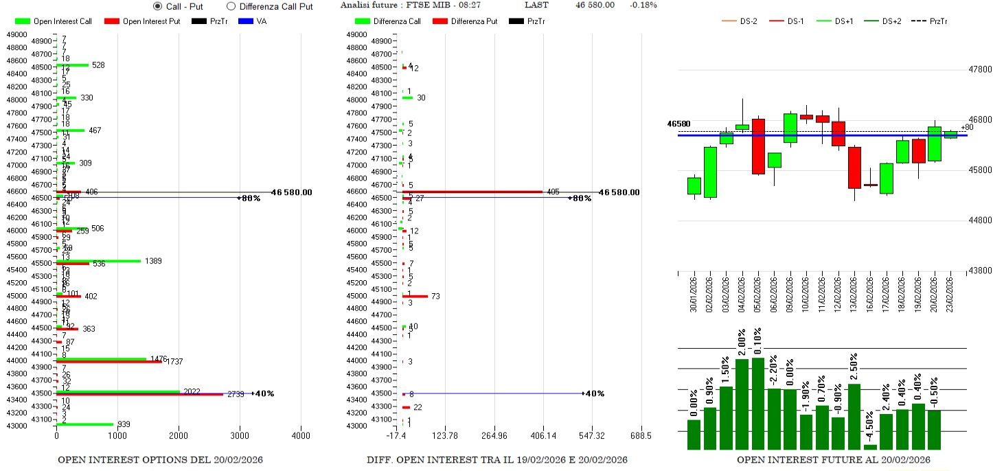Riposizionamenti di put a strike 46600 e future in lieve calo.