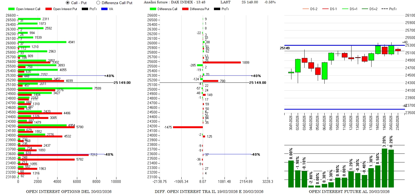 Chiusura di put a strike 24200 e nuove aperture a 25200 e 25600. Call in chiusura tra questi due strike e future sempre in pressione con prezzi su Va+40