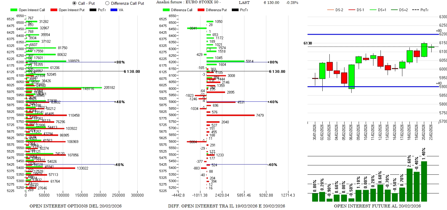 Con prezzi poco sotto Va+80 sono evidenti i tanti riposizionamenti di put tra 6100 e 5775 e ingressi di call a 6200. Future in aumento sulla rottura dei massimi.
