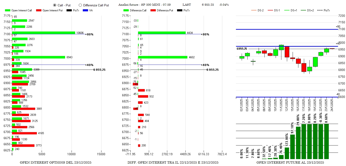 Ancora una giornata al rialzo e prezzi che arrivano a ridosso di Va+40. future in lieve aumento e, sul mercato delle opzioni, costruzione di un enorme spread di call tra 7000 e 7100 mentre sul lato put insistono sempre nuovi ingressi di contratti da 6875 a 6750.