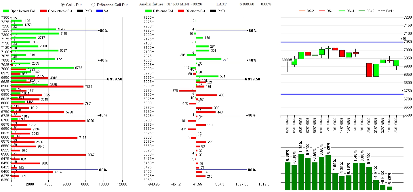 Riposizionamenti di put tra 6900 e 6750 e riposizionamenti di call tra 6950 e 7150. Future in ulteriore nuovo calo e sui minimi relativi in corrispondenza dei prezzi su Va+0