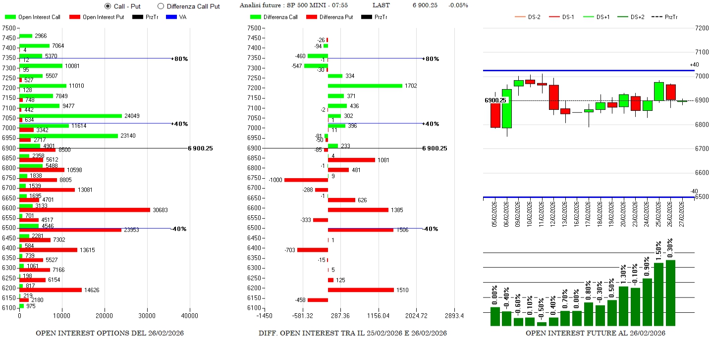Su S&P500 aumentano ancora i future mentre sul lato opzioni vengono rafforzati i contratti put e i contratti call ai lati del prezzo che è praticamente circondato da ben definiti livelli di gamma sensibilità.