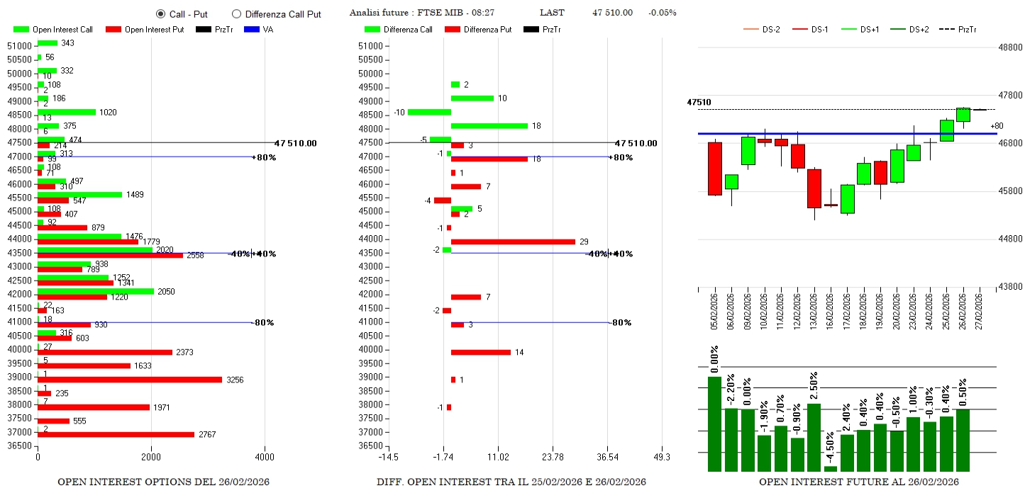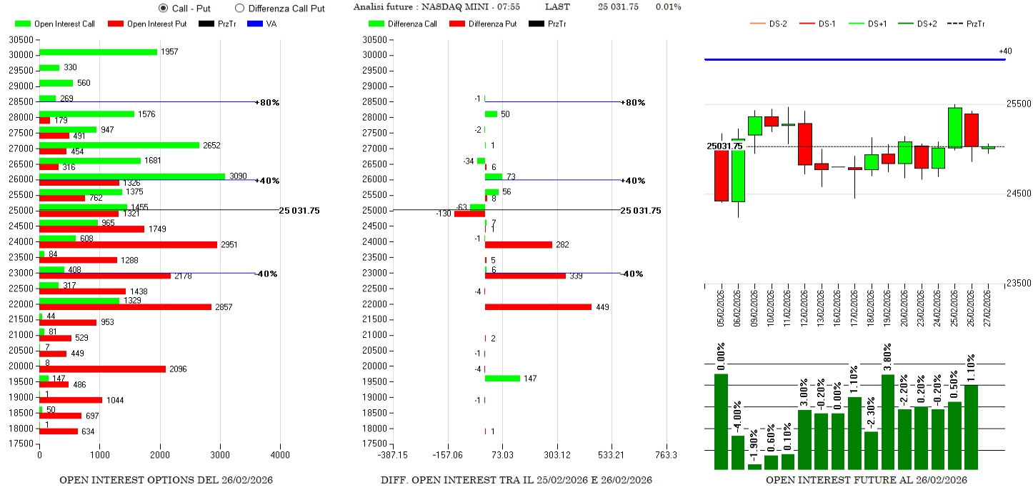 Anche qua è ben visibile, sulla rottura dei minimi della candela del 25 febbraio, l’aumento di future che segnano +1,10% seguiti da riposizionamenti di put tra 24000 e 22000 con quantità progressive assimilabili ad un ratio spread e qualche call sopra 25500.