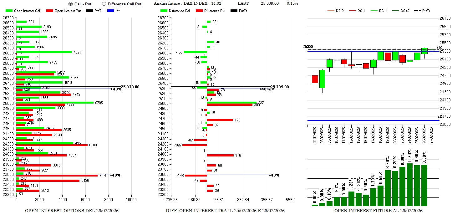 Sempre forte il Dax con operatori che chiudono call da 25300 a 26000, ricoprono area 25000 e 25200 e rollano internamente le put sotto al prezzo. Future sempre in pressione e su massimi numerici relativi a ridosso di Va+40 la cui rottura potrebbe provocare forti short squeeze