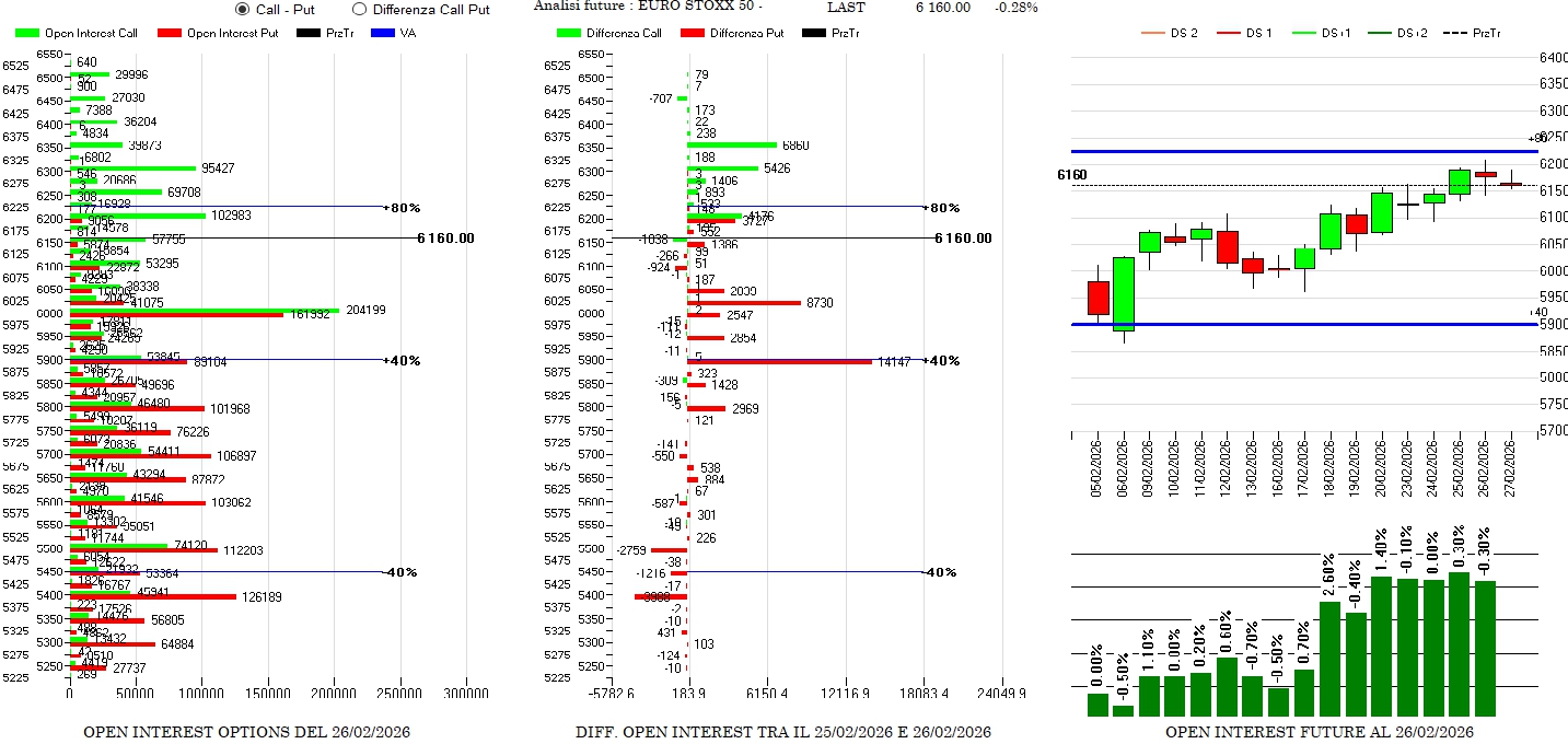 Future sempre in pressione anche se in lievissimo calo e put in aumento sotto al prezzo. Ricoperture sintetiche a 6200 e call che possono fungere da aree target a 6300 e 6350