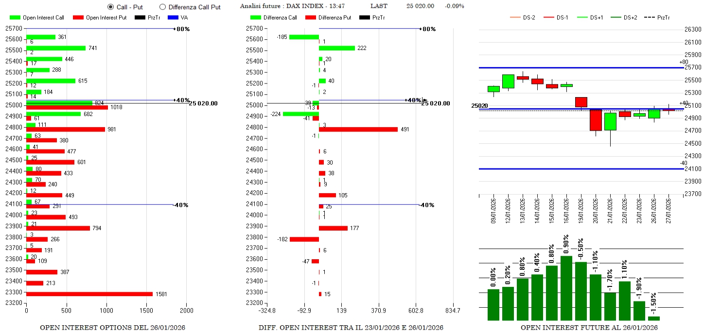 Aumentano put a strike 24800 e vengono rollate più in alto call. Future in sensibile calo con prezzi a ridosso, ormai da sei giorni, su Va+40