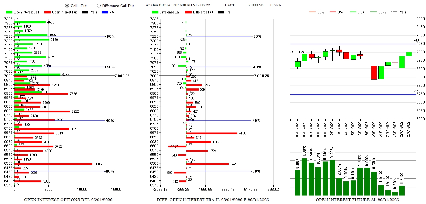 Sulla forza iniziano a rientrare future in funzione di ricopertura del lato call e contemporaneamente si assiste a forti aumenti di put tra 6950 e 6500 mentre sul lato call vengono alleggeriti contratti vicini all’Atm.