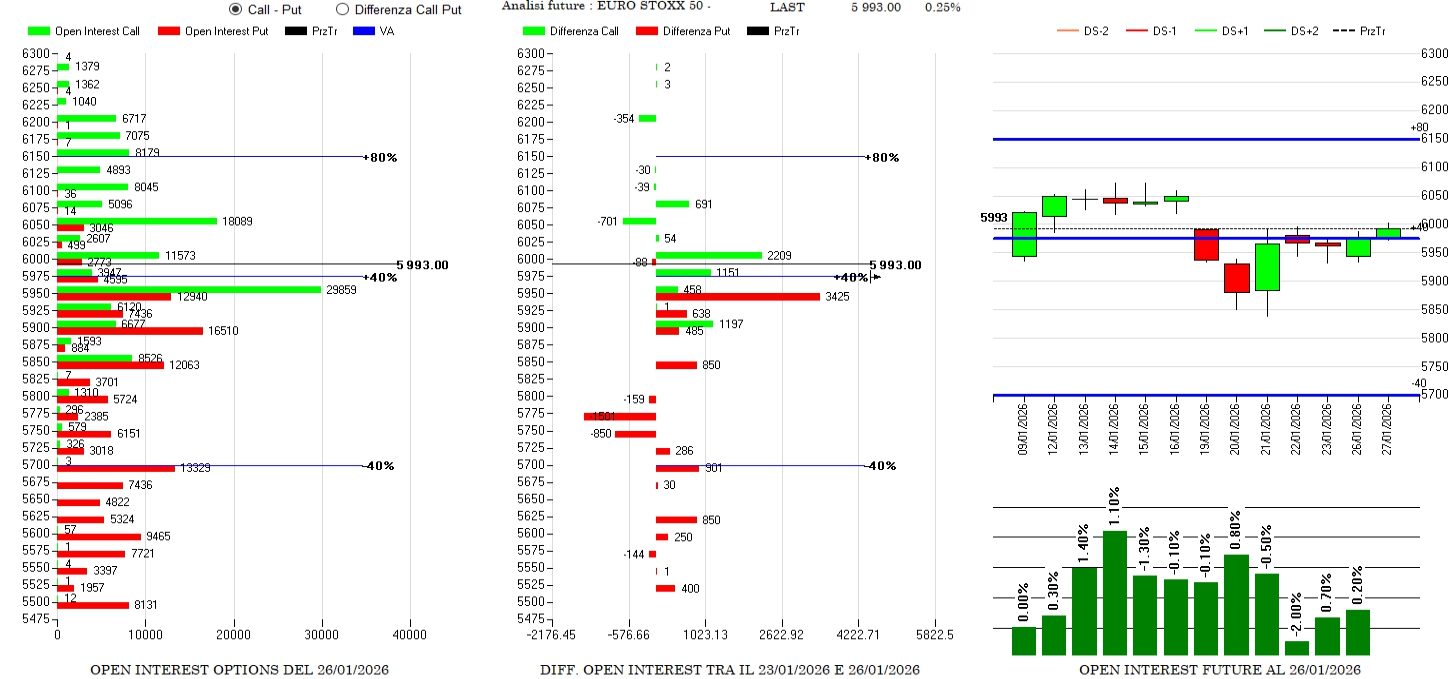 Piccolo aumento di future con prezzi poco sopra Va+40 e operatori che aprono put a strike 5950 e call a 6000 mostrando un range molto stretto.