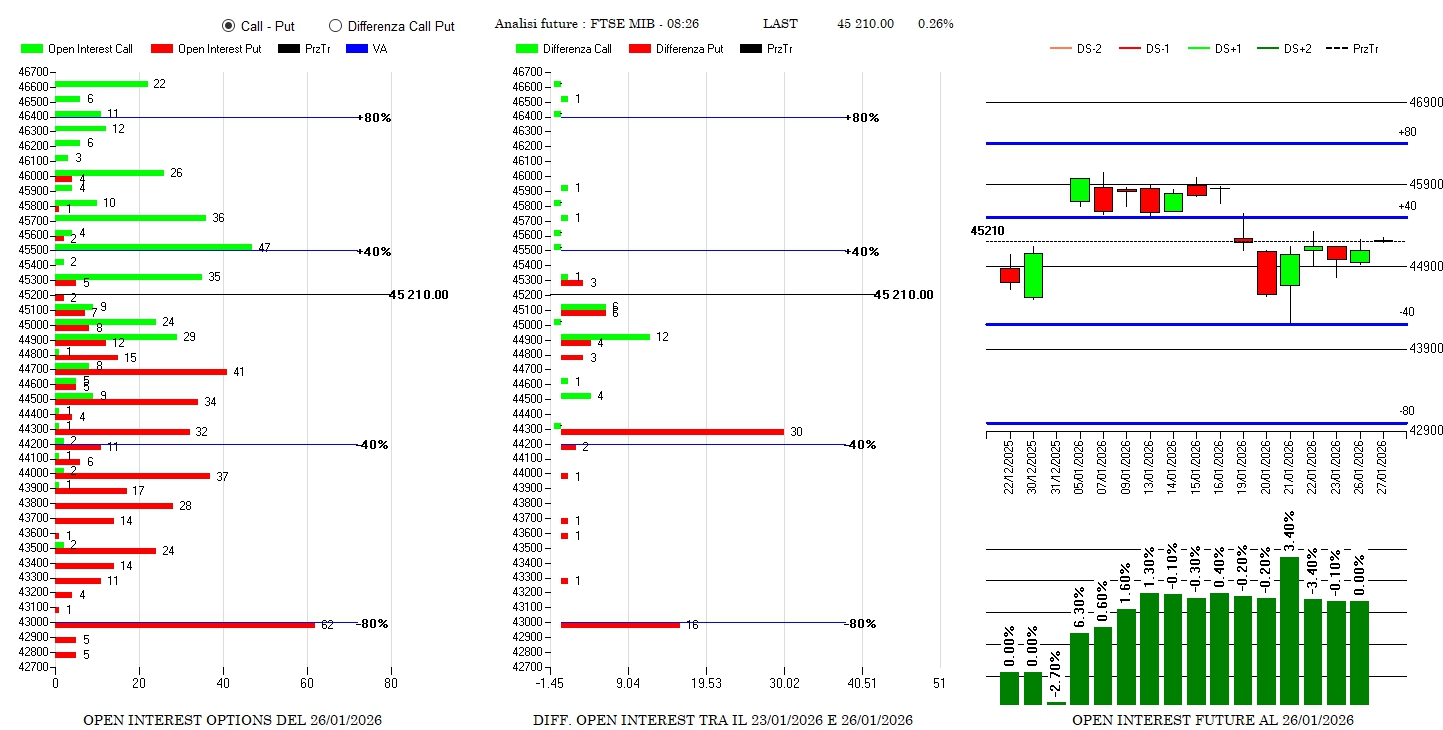 Nessuna variazioni della componente future ma solo riposizionamenti di put a 44300 e 43000 e ricoperture a 44900 e 45100