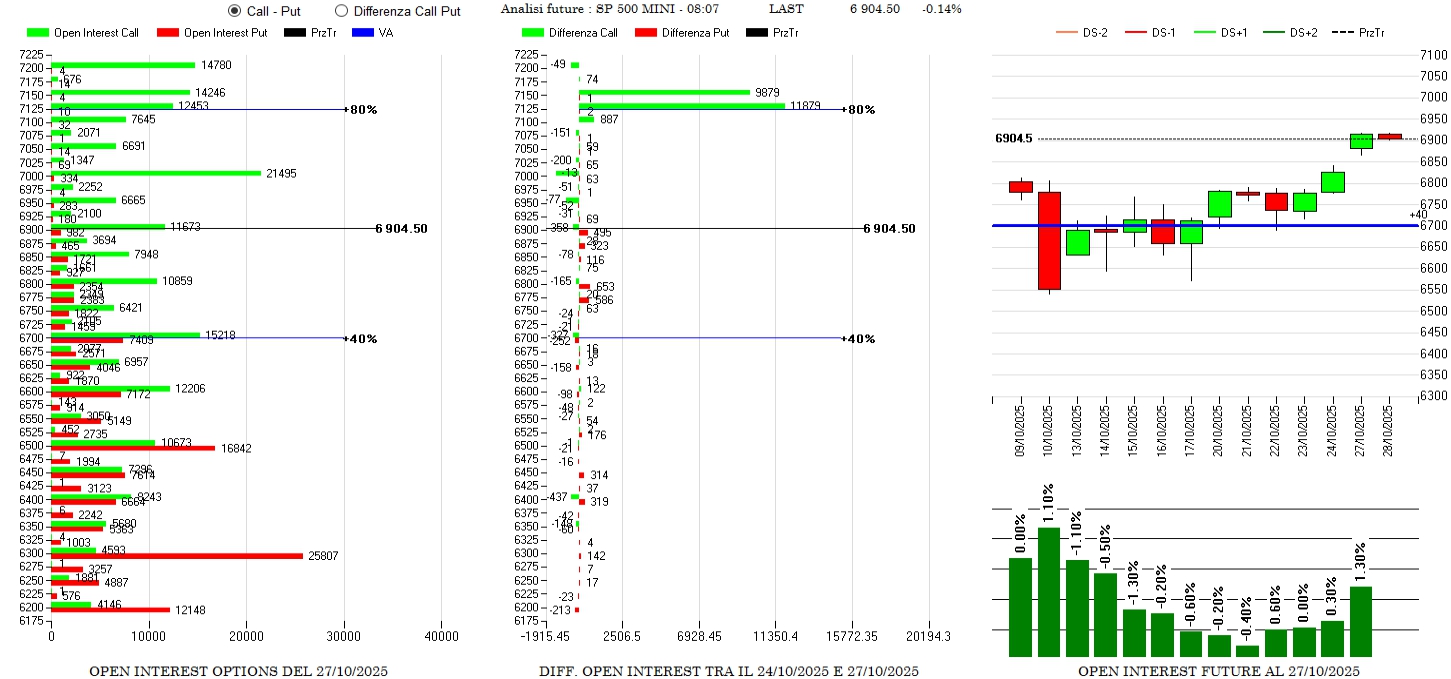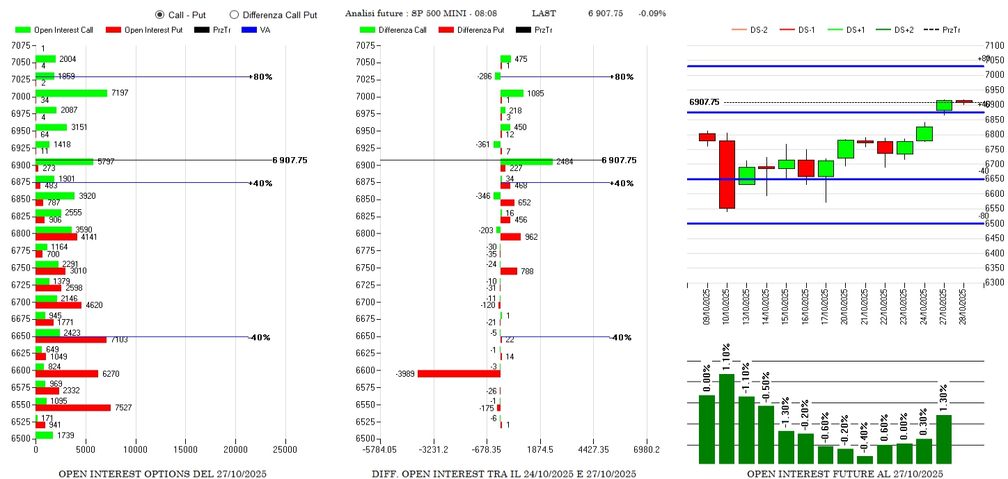 Il grande flusso volumetrico di call visto nella giornata di ieri si è trasformato in open interest a strike 7125 e 7150 proprio su Va+80. Contemporaneamente si assiste a piccoli alleggerimenti tra strike 6900 e 7000 mentre sul lato put si segnalano ingressi a 6900 e 6775.
