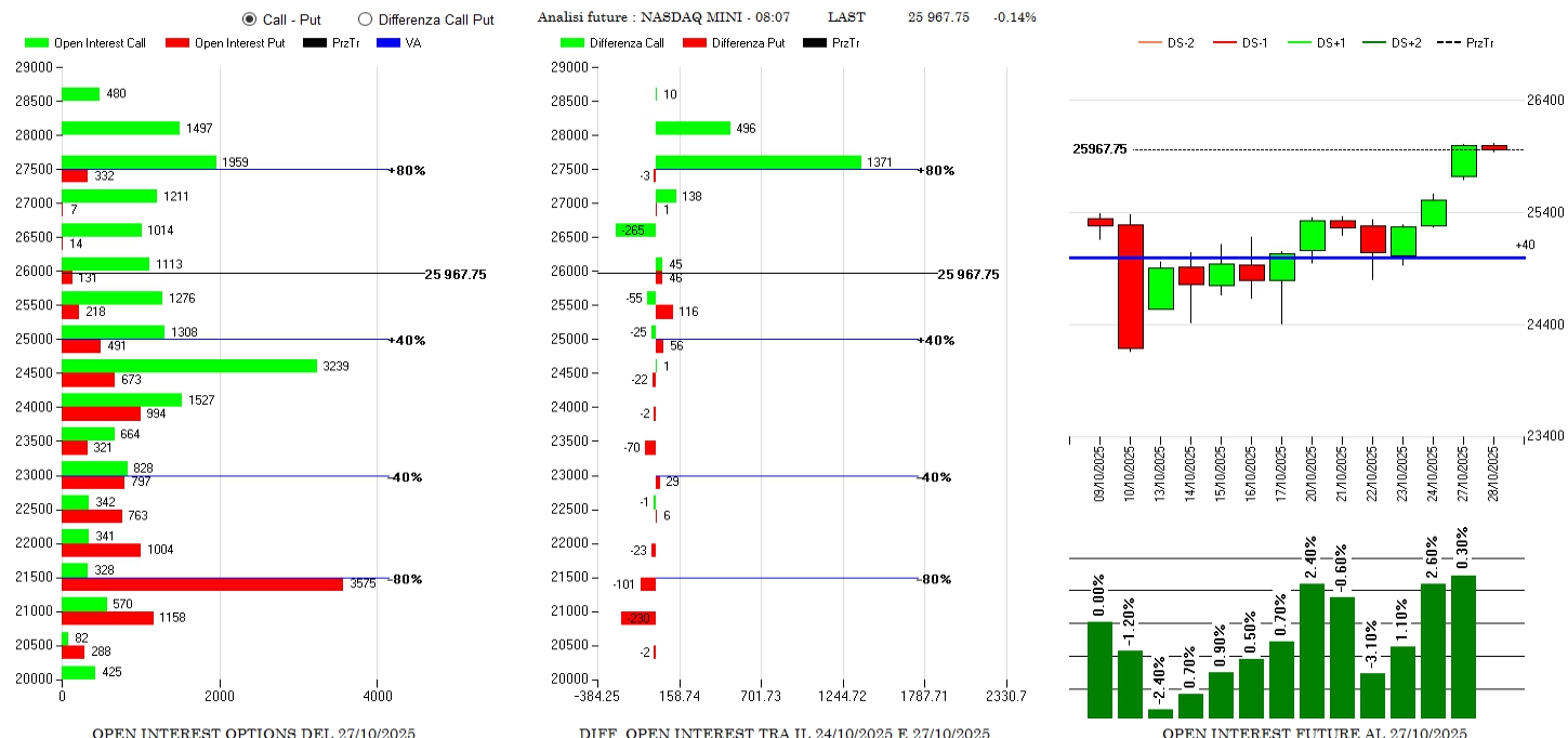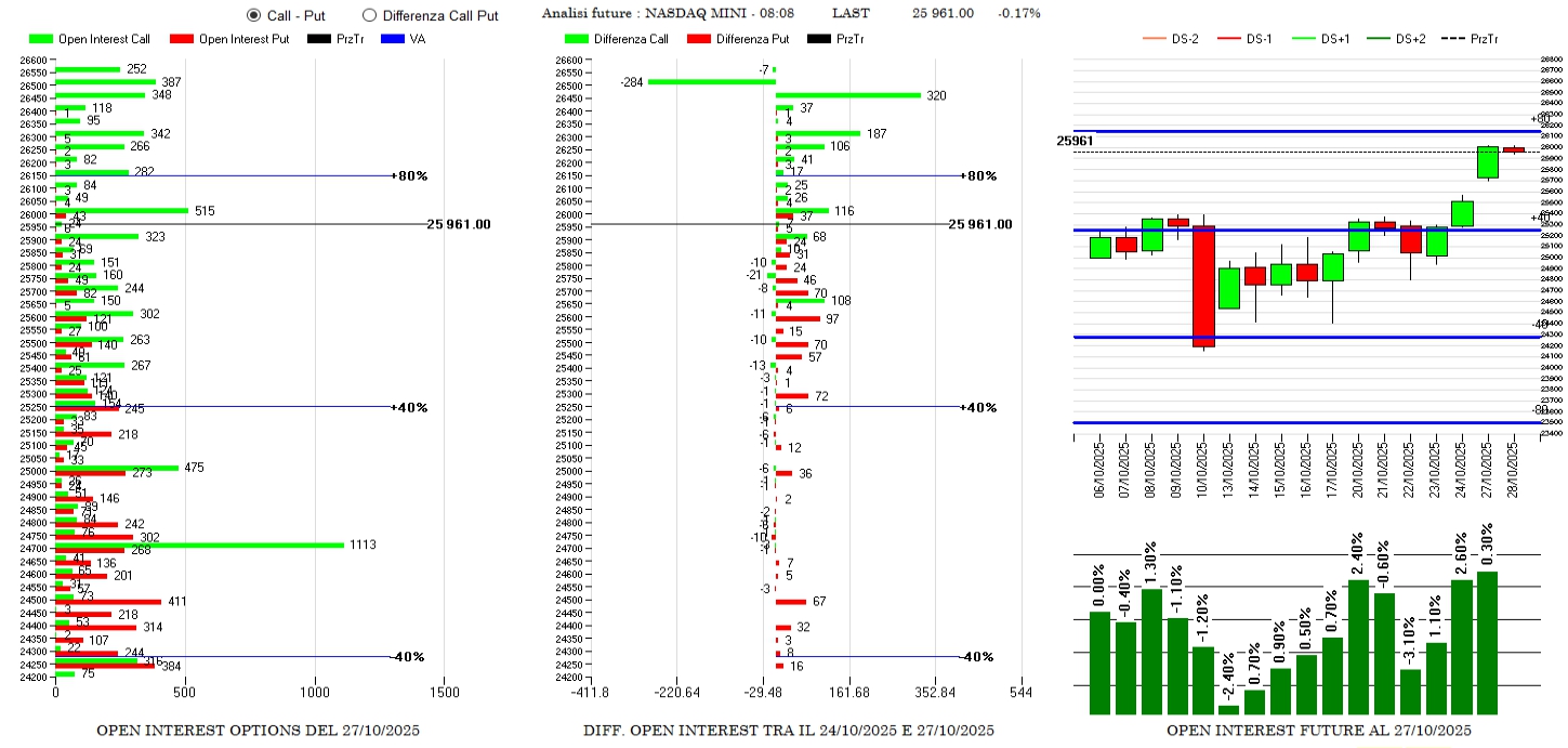 Anche qua la componente future sale ai massimi di periodo e sul lato opzioni entrano importanti quantità di call da strike 26000 a strike 26450. Put in lieve aumento sotto al prezzo.