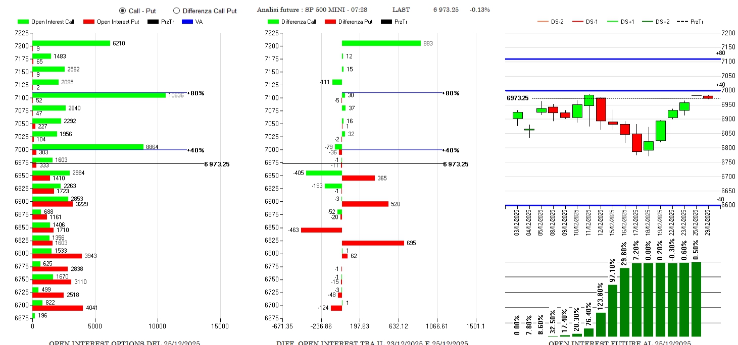Con prezzi sempre a ridosso di Va+40 si segnalano future in lieve aumento insieme nuovi ingressi di put tra 6950 e 6800. Call in alleggerimento a strike 6950 e 7125 e riposizionamenti a 7200.