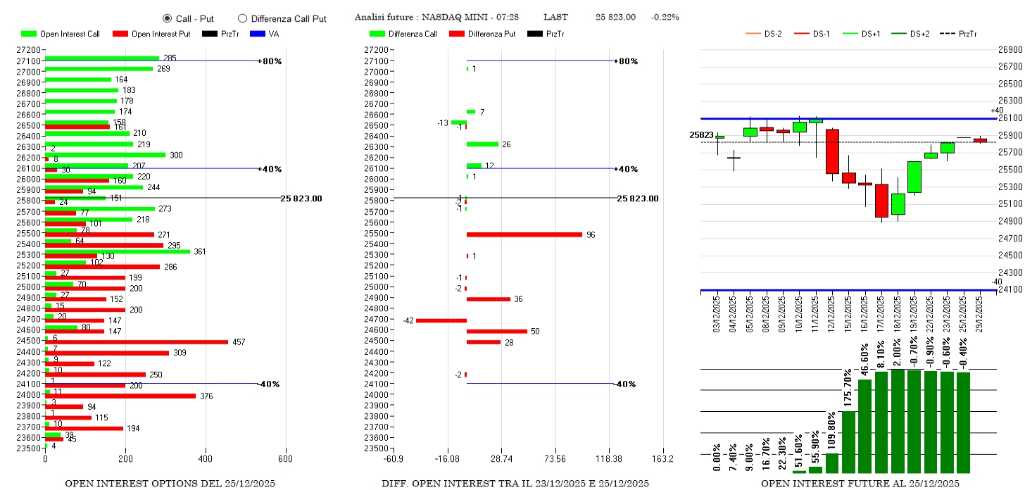 Future in lieve calo e riposizionamenti di put tra 25500 e 24500 e di call a 26300.